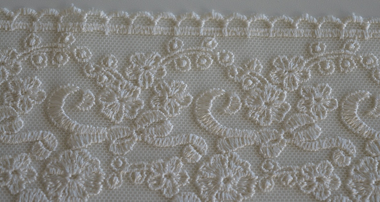 PIZZO TULLE RICAMATO ART. LIONE ALTO : CM 10 COLORE: AVORIO COMPOSIZIONE : BASE TULLE RICAMATO 100% POLIESTERE IL PREZZO E IL QUANTITATIVO SI INTENDE IN MT LINEARI