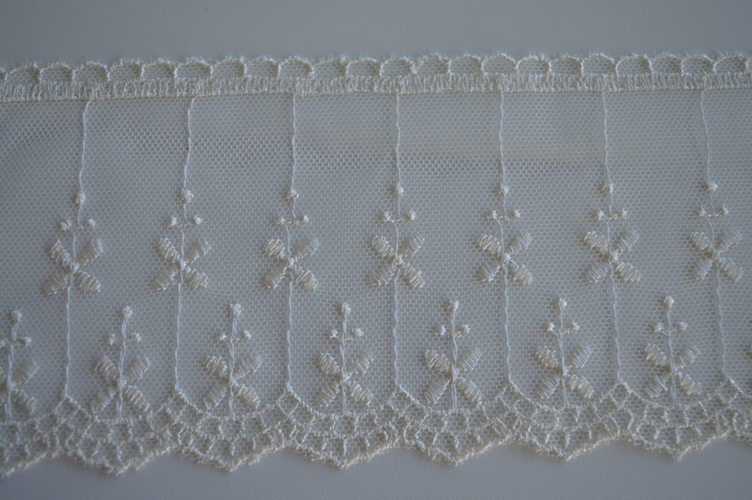 PIZZO TULLE RICAMATO ART. SAVANNAH ALTO : CM 10 COLORE: AVORIO COMPOSIZIONE : BASE TULLE RICAMATO 100% POLIESTERE IL PREZZO E IL QUANTITATIVO SI INTENDE IN MT LINEARI