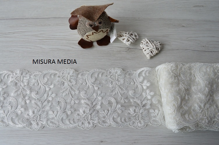 PIZZO TULLE RICAMATO ART 1993 COLORE AVORIO COMPOSIZIONE 100% POLIESTERE DISPONIBILE IN DIVERSE MISURE ALTEZZA GRANDE CM 35 MEDIO CM 13 INTRAMEZZO CM4,5 FINALE PICCOLO CM 4 IL PREZZO E IL QUANTITATIVO EQUIVALGONO A MT LINEARE I METRAGGIO è TAGLIATO INTERO FINO ALLA DISPONIBILITA DELLA PEZZETTA