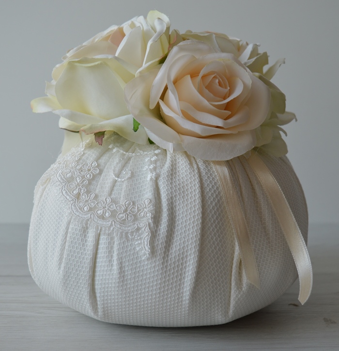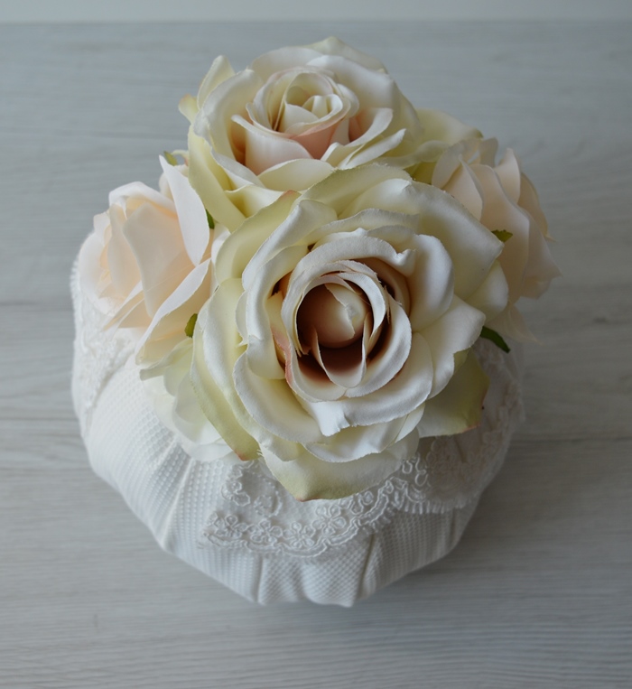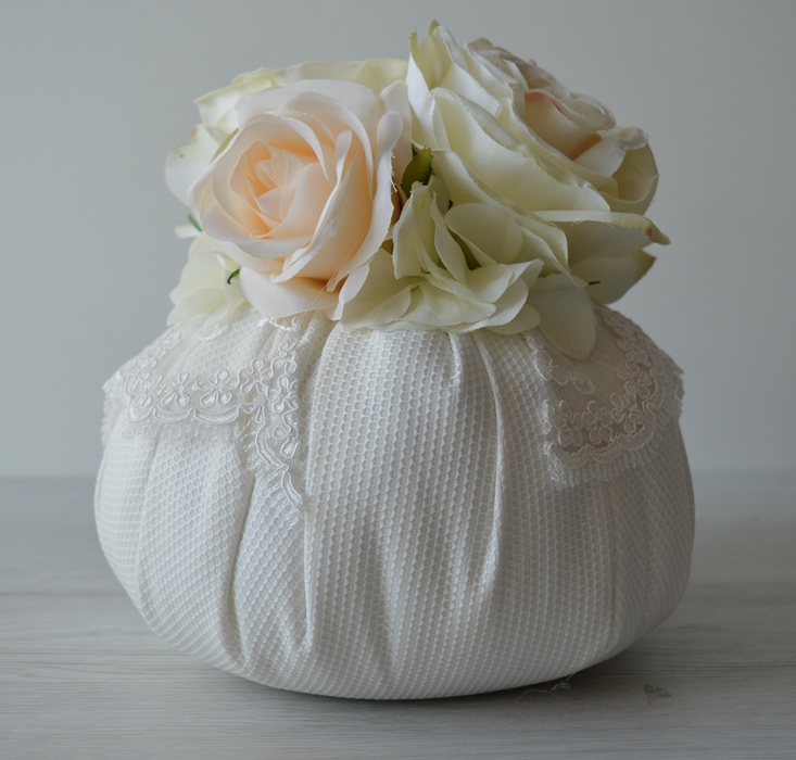 puff artigianale di emy ricami in cotone piquet con rose e ortensie e pizzo rebrodè composizione interno ovatta 100% poliestere esterno 100% cotone piquet colore avorio dimensioni diametro cm 20X20 alta peso gr 330