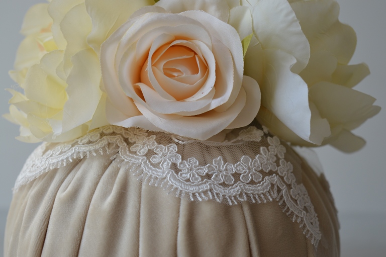 puff artigianale di emy ricami in velluto poliestere con rose e ortensie e pizzo rebrodè composizione interno ovatta 100% poliestere esterno velluto poliestere colore beige dimensioni diametro cm 18x18 alta peso gr 270