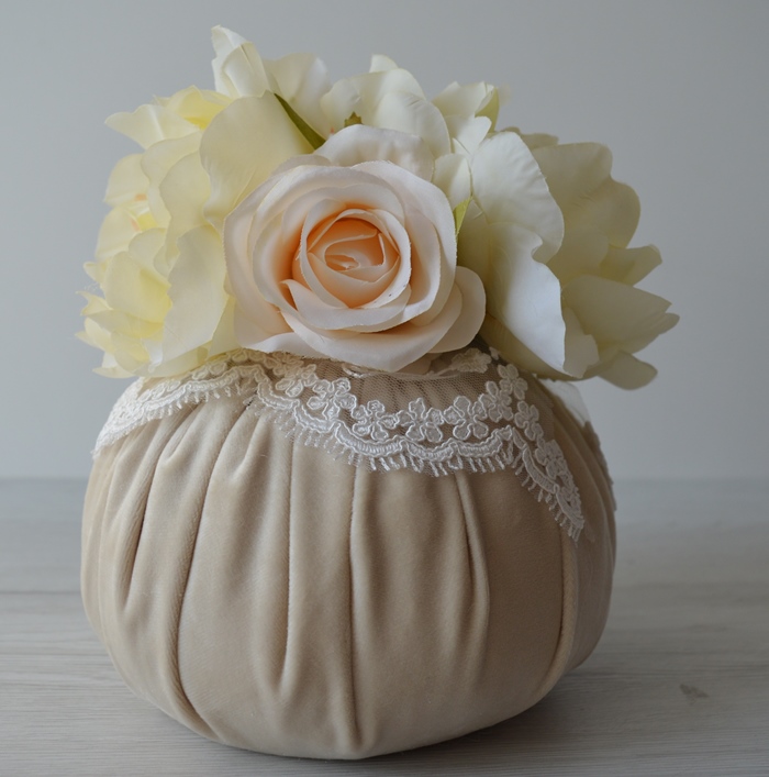 puff artigianale di emy ricami in velluto poliestere con rose e ortensie e pizzo rebrodè composizione interno ovatta 100% poliestere esterno velluto poliestere colore beige dimensioni diametro cm 18x18 alta peso gr 270