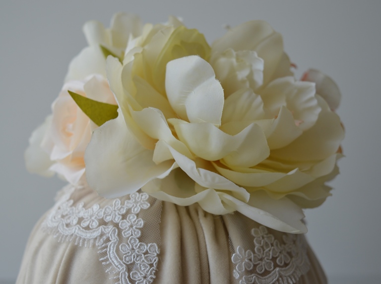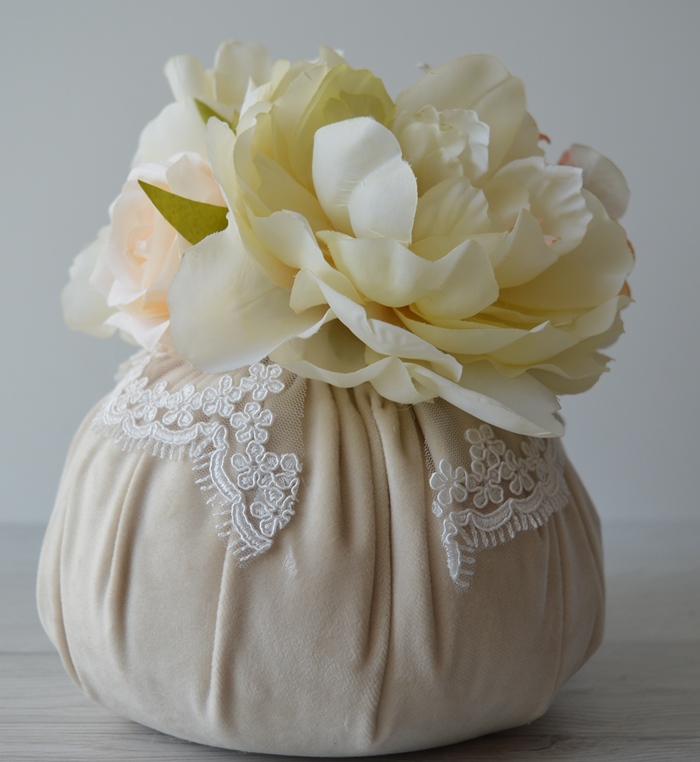 puff artigianale di emy ricami in velluto poliestere con rose e ortensie e pizzo rebrodè composizione interno ovatta 100% poliestere esterno velluto poliestere colore beige dimensioni diametro cm 18x18 alta peso gr 270