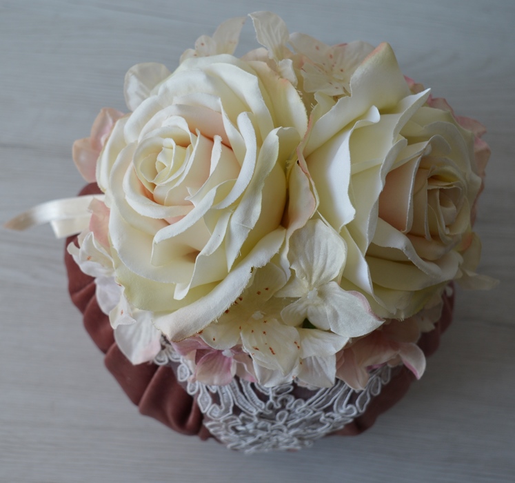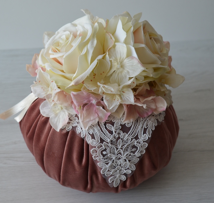 puff artigianale di emy ricami in velluto poliestere con rose e ortensie e pizzo rebrodè composizione interno ovatta 100% poliestere esterno velluto poliestere colore rosa antico dimensioni diametro cm 23x23 alta peso gr 350