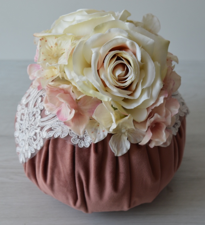 puff artigianale di emy ricami in velluto poliestere con rose e ortensie e pizzo rebrodè composizione interno ovatta 100% poliestere esterno velluto poliestere colore rosa antico dimensioni diametro cm 23x23 alta peso gr 350