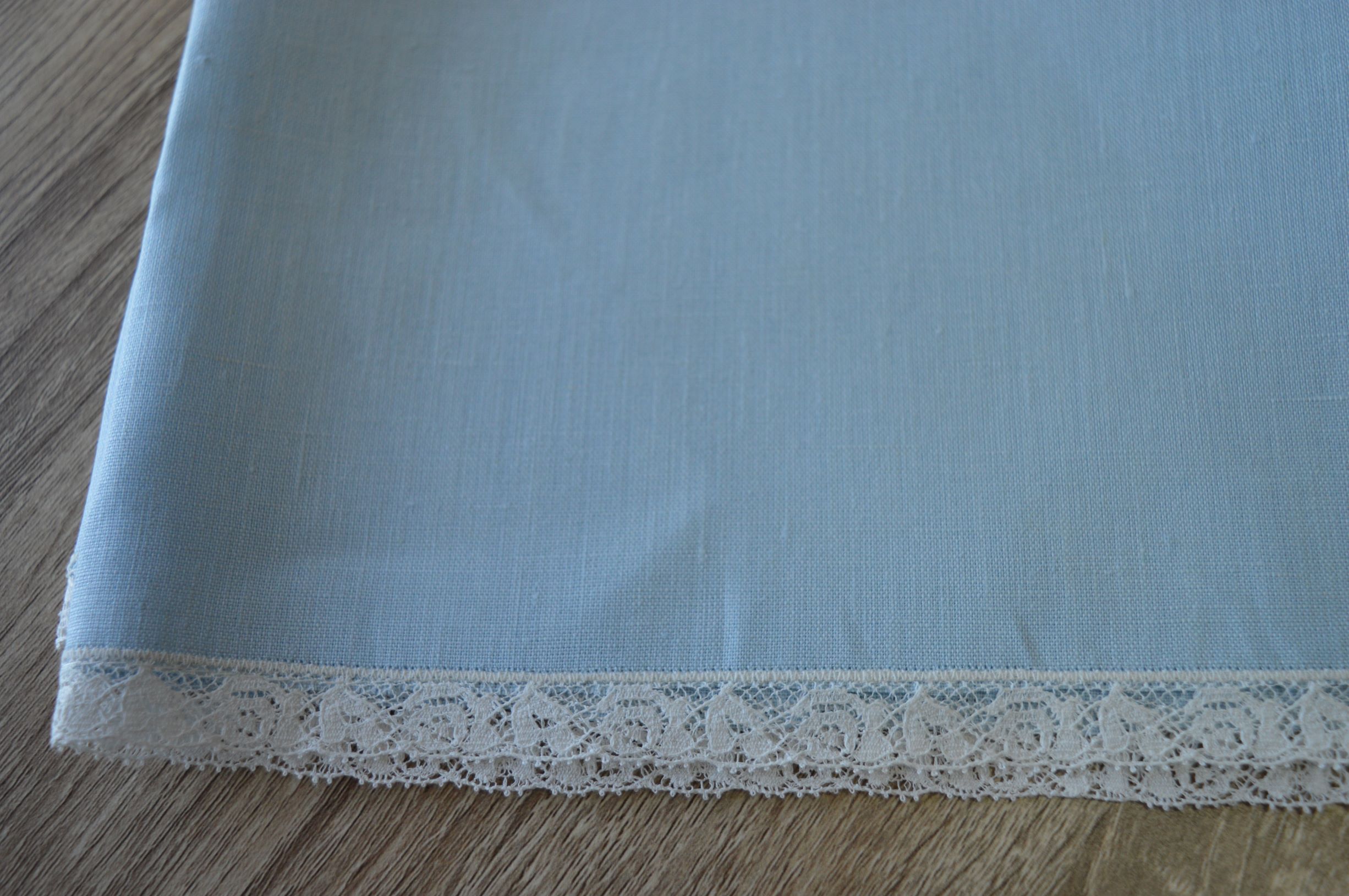 Mussola per nascita in lino e pizzo misura cm 50x70 composizione 100% lino rifinito con pizzo valenciennes colore fondo celeste e pizzo avorio su richiesta possibilità di personalizzazzione confezionato in un elegantissima scatola personalizzata Emy ricami