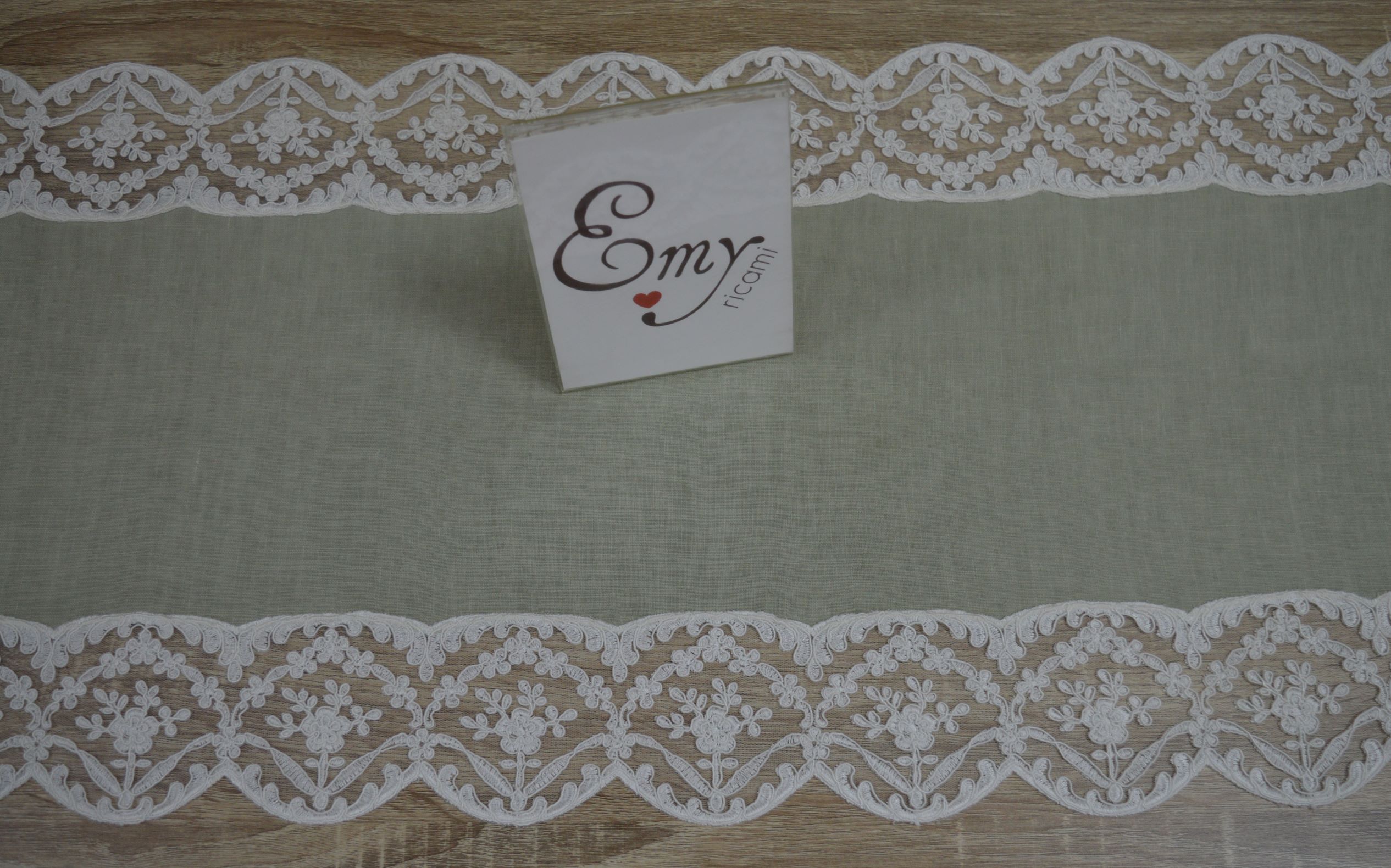 Ranner in lino e rebrode artigianale di Emy ricami mis cm 35x142 col verde salvia art Tania