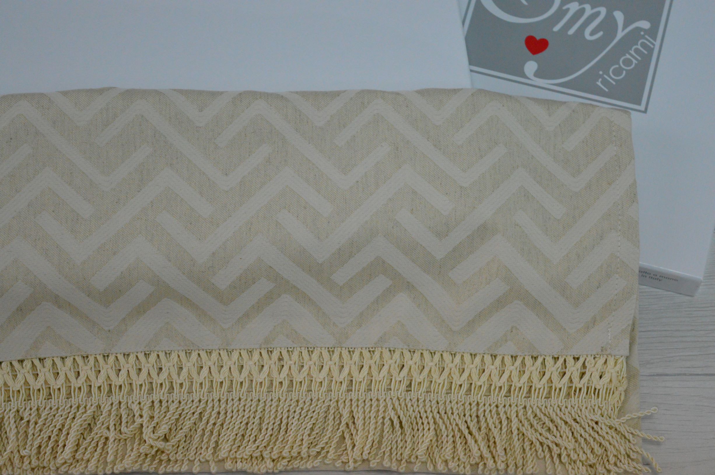 RUNNER ARTIGIANALE CON FRANGIA DI EMY RICAMI COLORE AVORIO E TORTORA COMPOSIZIONE 65% POLIESTERE 25% VISCOSA 10% LINO FRANGIA 100% POLIESTERE MISURA CM 45X160 SI PUO ANCHE PERSONALIZZARE PER QUALSIASI INFORMAZIONE CONTATTARE AI NOSTRI INFO
