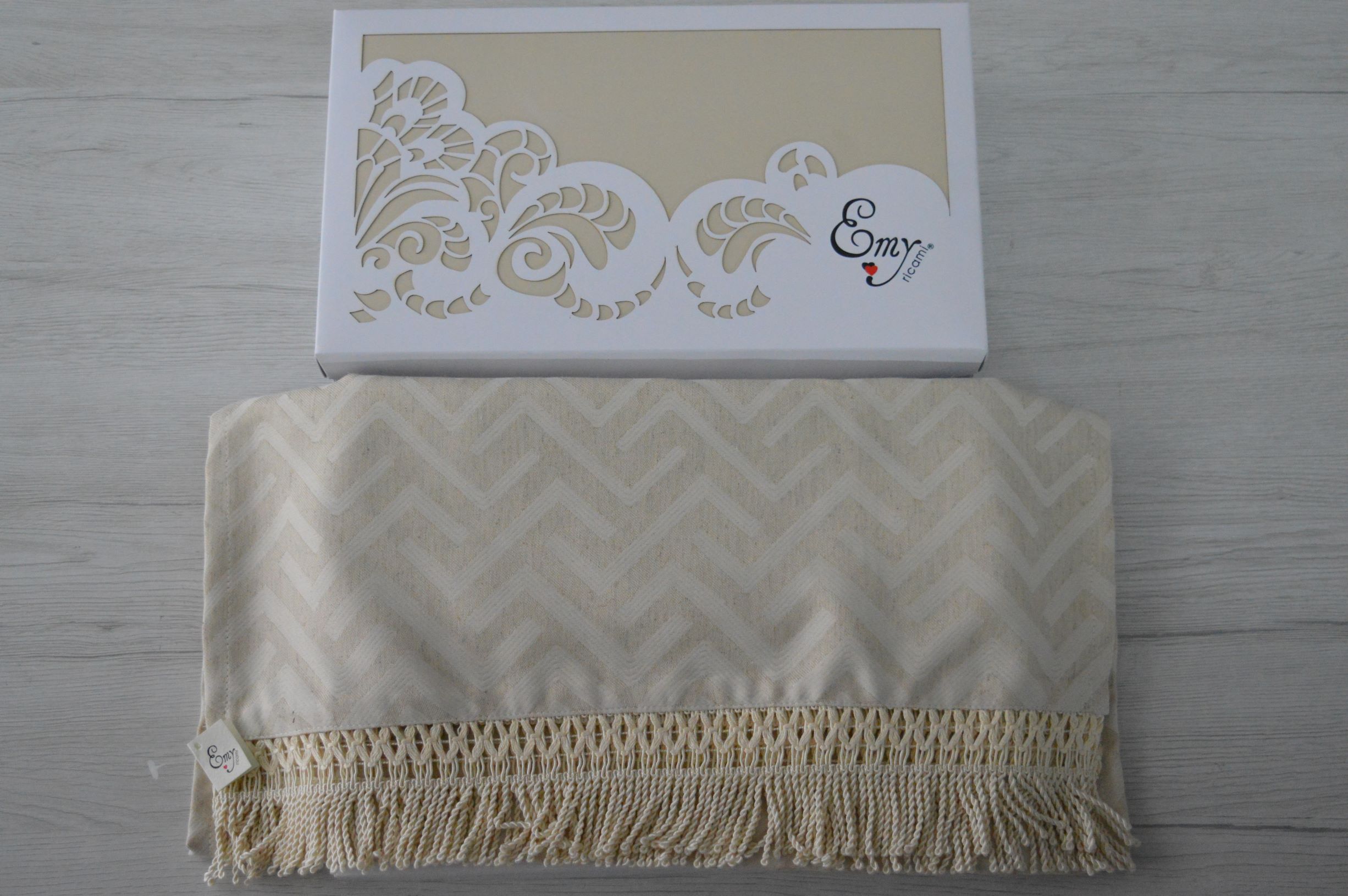 RUNNER ARTIGIANALE CON FRANGIA DI EMY RICAMI COLORE AVORIO E TORTORA COMPOSIZIONE 65% POLIESTERE 25% VISCOSA 10% LINO FRANGIA 100% POLIESTERE MISURA CM 45X160 SI PUO ANCHE PERSONALIZZARE PER QUALSIASI INFORMAZIONE CONTATTARE AI NOSTRI INFO