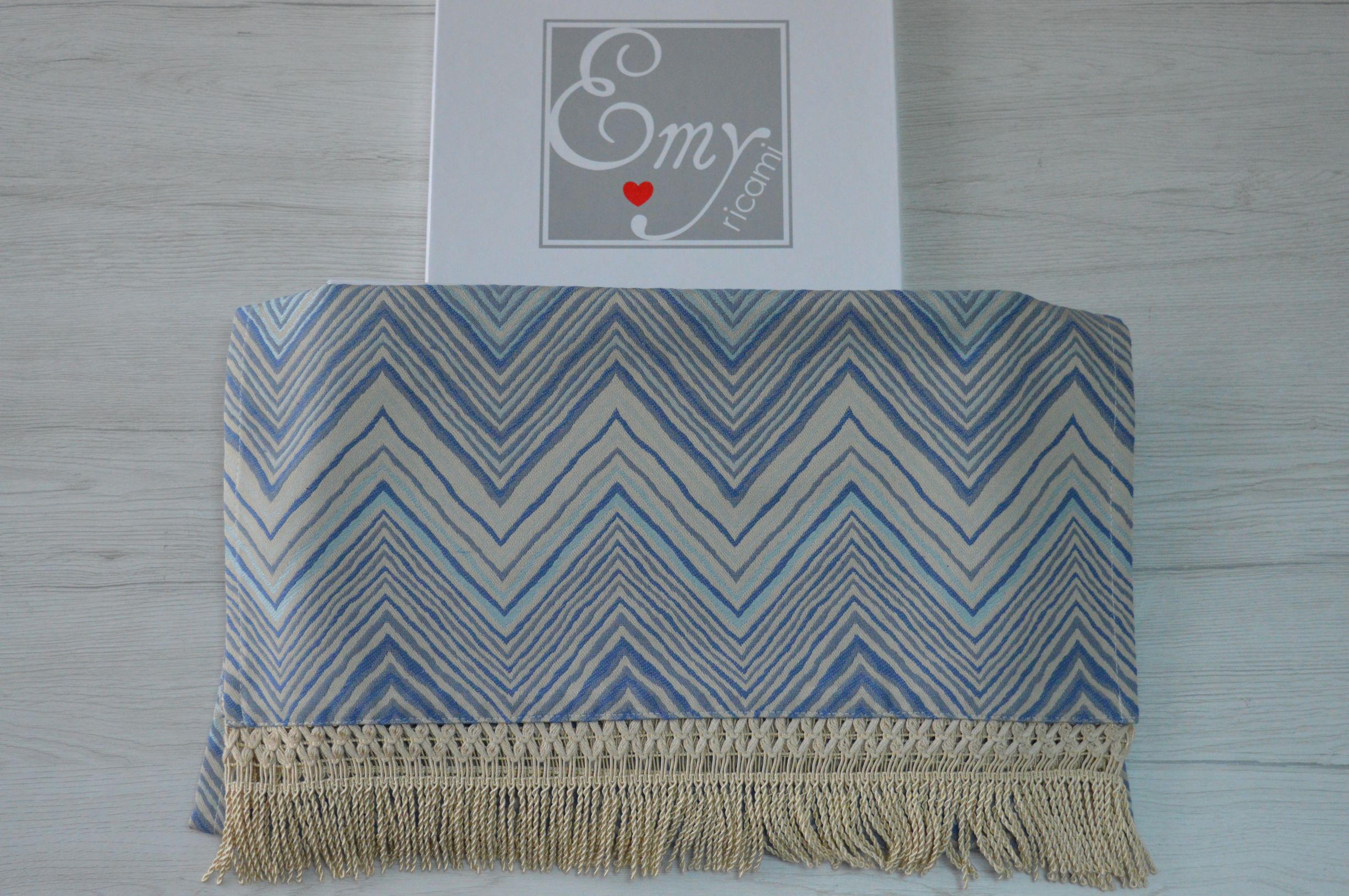 RUNNER ARTIGIANALE CON FRANGIA DI EMY RICAMI COLORE AZZURRO COMPOSIZIONE 46 % COTONE 36% POLIESTERE 18% VISCOSA FRANGIA 100% POLIESTERE MISURA CM 48X115 SI PUO ANCHE PERSONALIZZARE PER QUALSIASI INFORMAZIONE CONTATTARE AI NOSTRI INFO