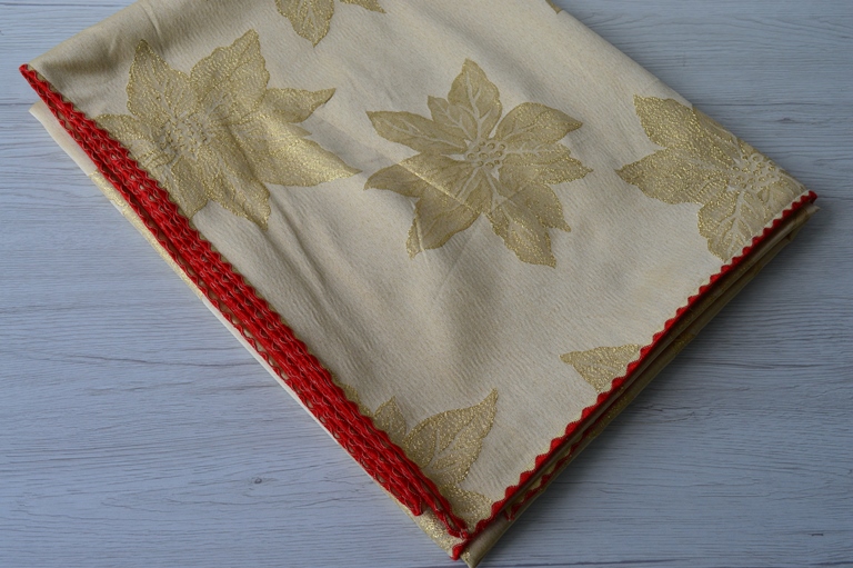 TAPPETO SERVIZIO DA TAVOLA NATALIZIO MISURA CM 135X340 COLORE ORO CON FINITURE IN ROSSO COMP. 65% POLIESTERE 35% COTONE