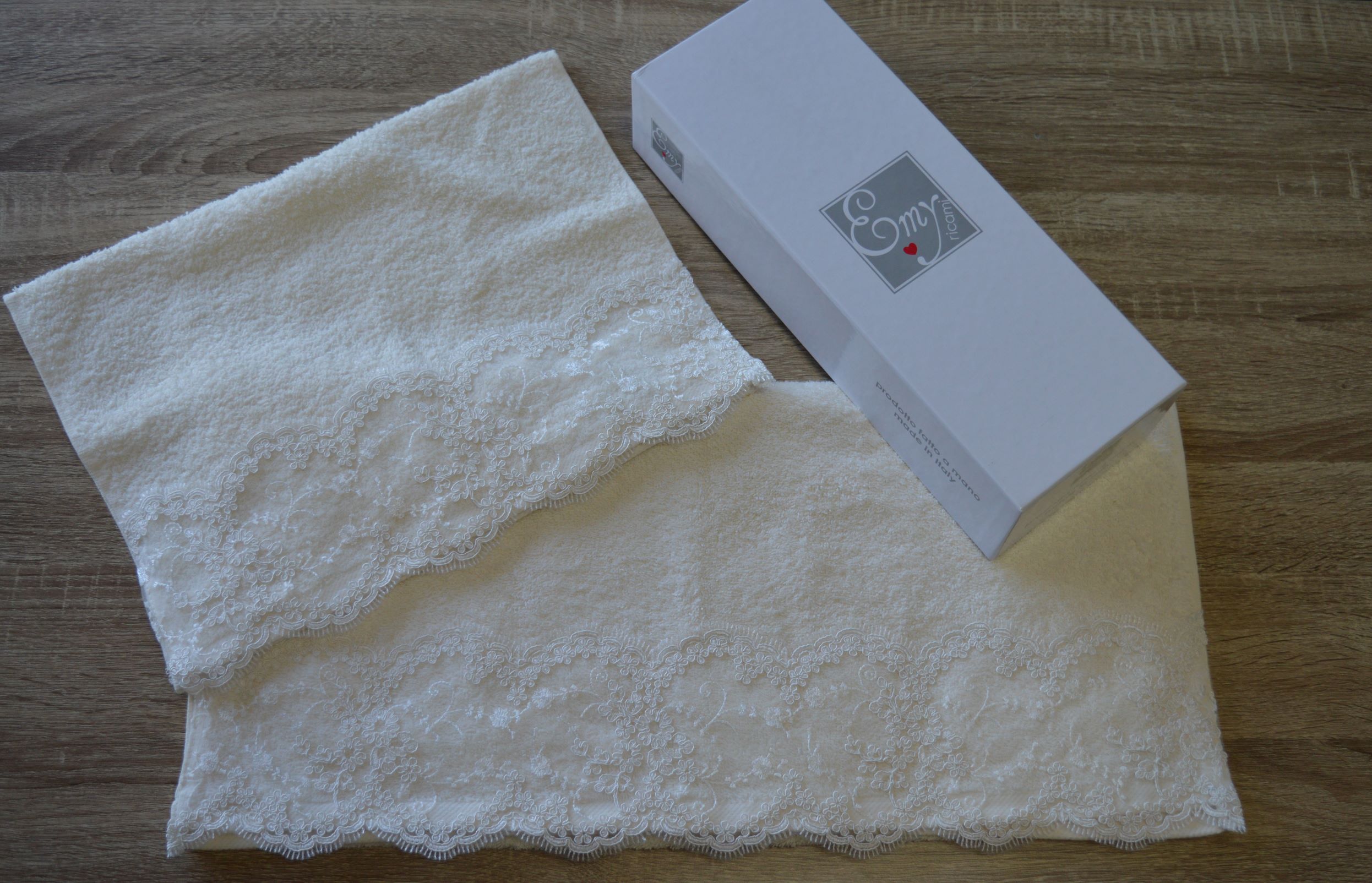 coppia asciugamano artigianale di emy ricami colore avorio composizione 100% cotone misura ospite cm 38x58 misura viso cm 59x110 peso 500gr al mtq lavaggio 40° rifinita in basso con pizzo rebrode e confezionata in un elegante scatola regalo personalizzata emy ricami per grossi quantivi o per un evento contattare ai nostri info.