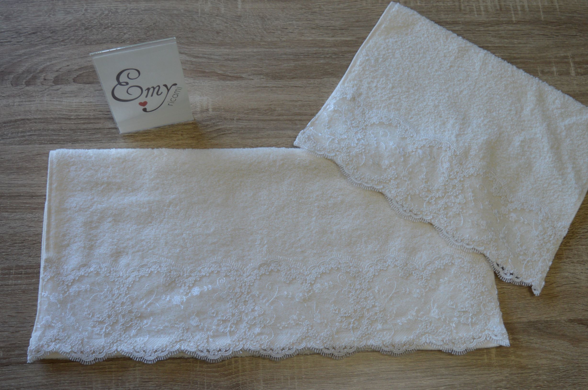 coppia asciugamano artigianale di emy ricami colore avorio composizione 100% cotone misura ospite cm 38x58 misura viso cm 59x110 peso 500gr al mtq lavaggio 40° rifinita in basso con pizzo rebrode e confezionata in un elegante scatola regalo personalizzata emy ricami per grossi quantivi o per un evento contattare ai nostri info.
