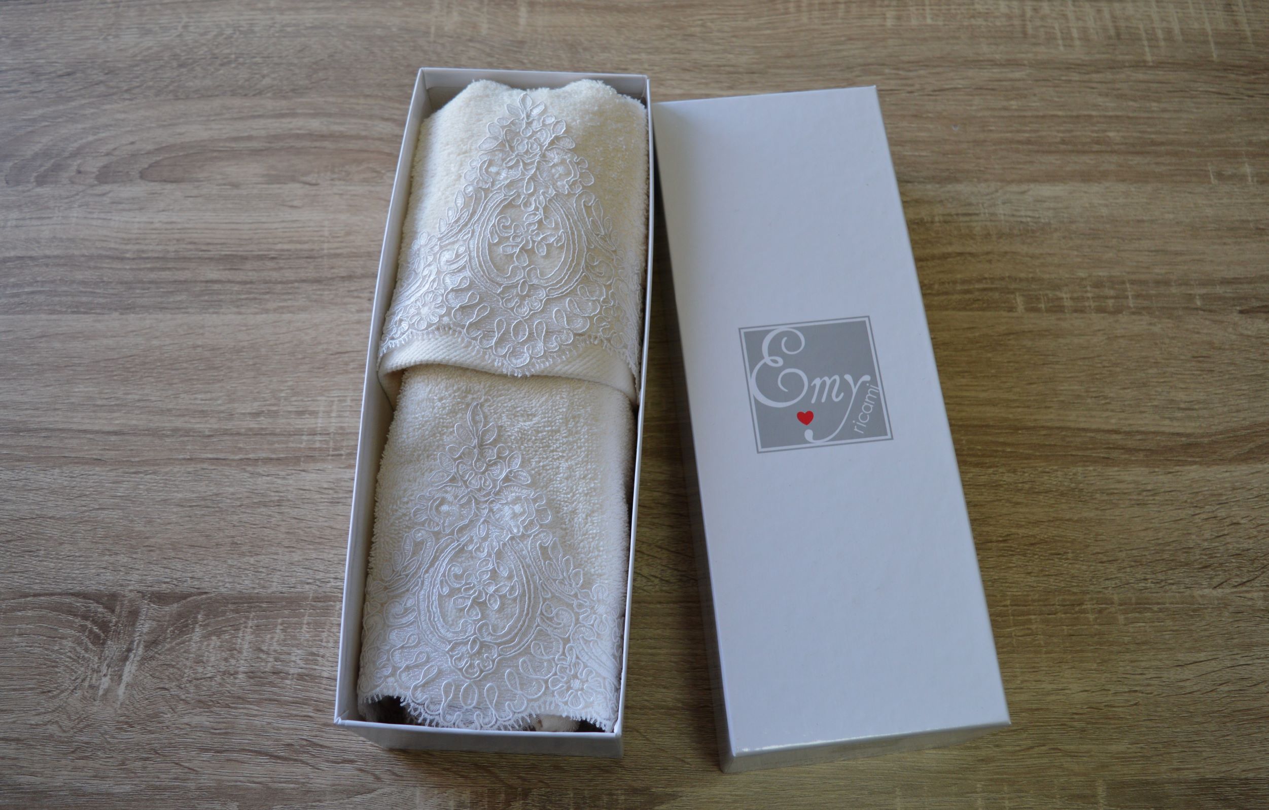 coppia asciugamano artigianale di emy ricami colore avorio composizione 100% cotone misura ospite cm 40x60 misura viso cm 60x115 peso 500gr al mtq lavaggio 40° rifinita in basso con pizzo rebrode e confezionata in un elegante scatola personalizzata per grossi quantivi o per un evento contattare ai nostri info.