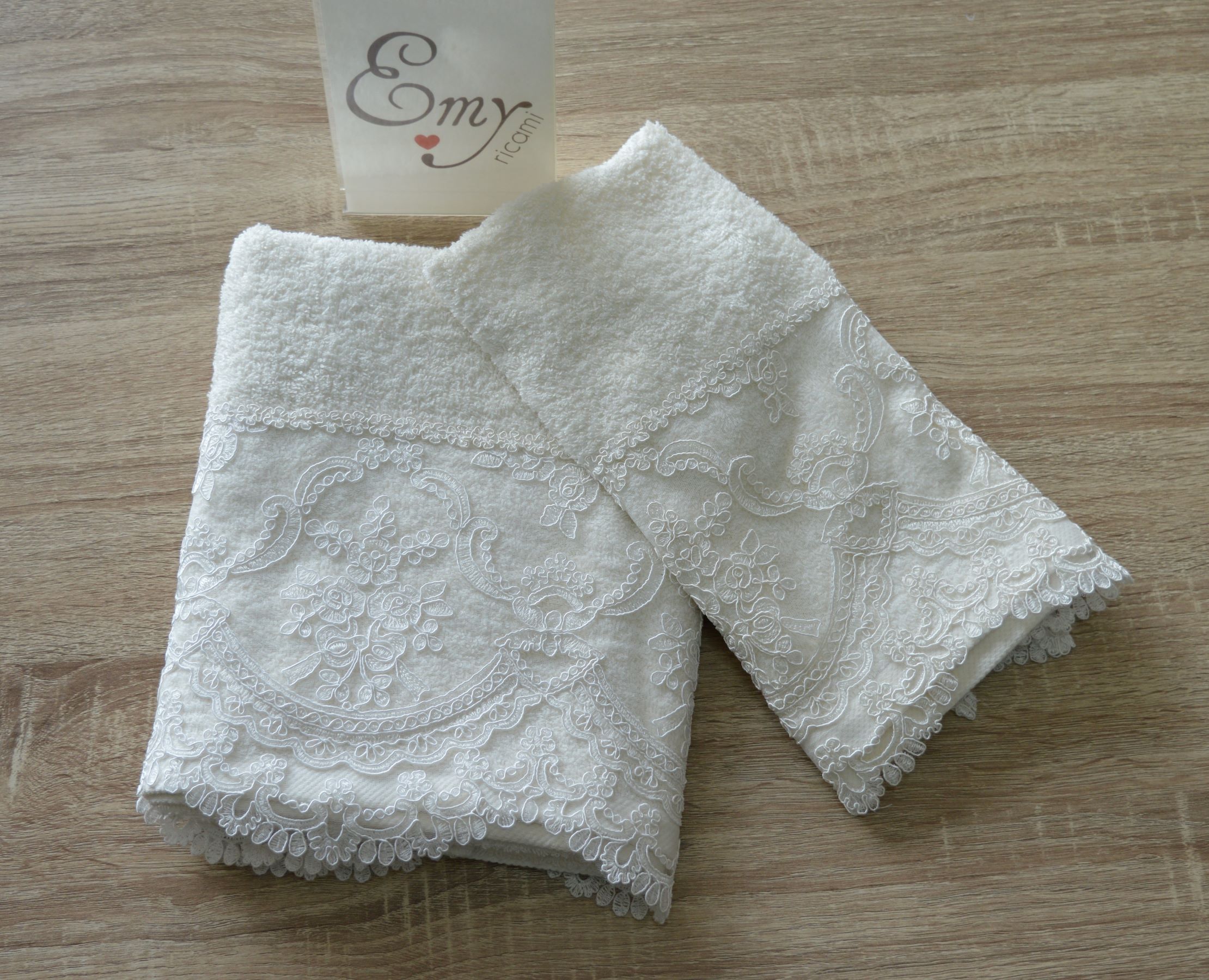 coppia asciugamano artigianale di emy ricami colore avorio composizione 100% cotone misura ospite cm 40x60 misura viso cm 60x115 peso 500gr al mtq lavaggio 40° rifinita in basso con pizzo rebrode e confezionata in un elegante scatola personalizzata per grossi quantivi o per un evento contattare ai nostri info.