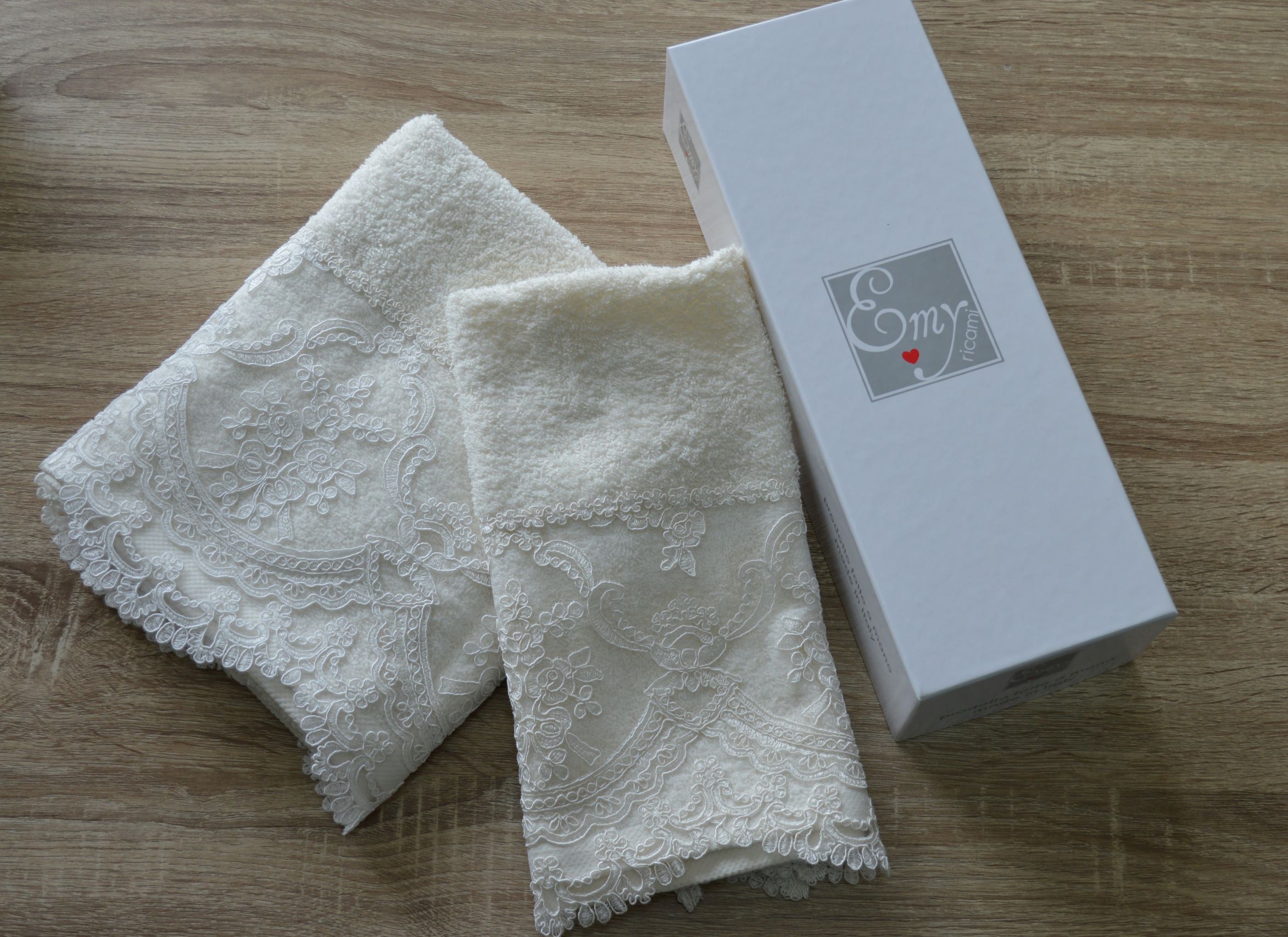 coppia asciugamano artigianale di emy ricami colore avorio composizione 100% cotone misura ospite cm 40x60 misura viso cm 60x115 peso 500gr al mtq lavaggio 40° rifinita in basso con pizzo rebrode e confezionata in un elegante scatola personalizzata per grossi quantivi o per un evento contattare ai nostri info.