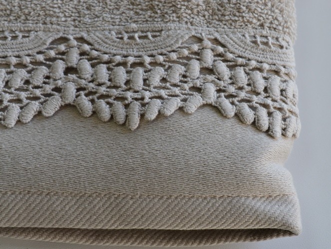 SET ASCIUGAMANI SPUGNA 1+1 COLORE TORTORA RIFINITA CON PIZZO MACRAME PESO 340 GSM MISURE: GRANDE CM 58X102 - PICCOLA CM 39X55 COMPOSIZIONE 100% COTONE