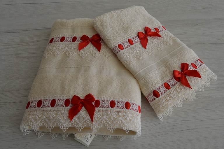 SET ASCIUGAMANI SPUGNA E PIZZO MACRAME ROSSO