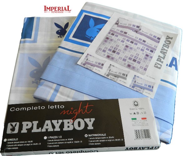 COMPLETO LETTO MATRIMONIALE STAMPATO PLAY BOY NIGHT COMPOSIZIONE 100% COTONE MISURE LENZUOLO SOPRA STAMPATO BALZATO CM 250X300 LENZUOLO SOTTO STAMPATO CON ANGOLI CM 180X200 +25 2 FEDERE STAMPATE COLORE BLU MADE IN ITALY
