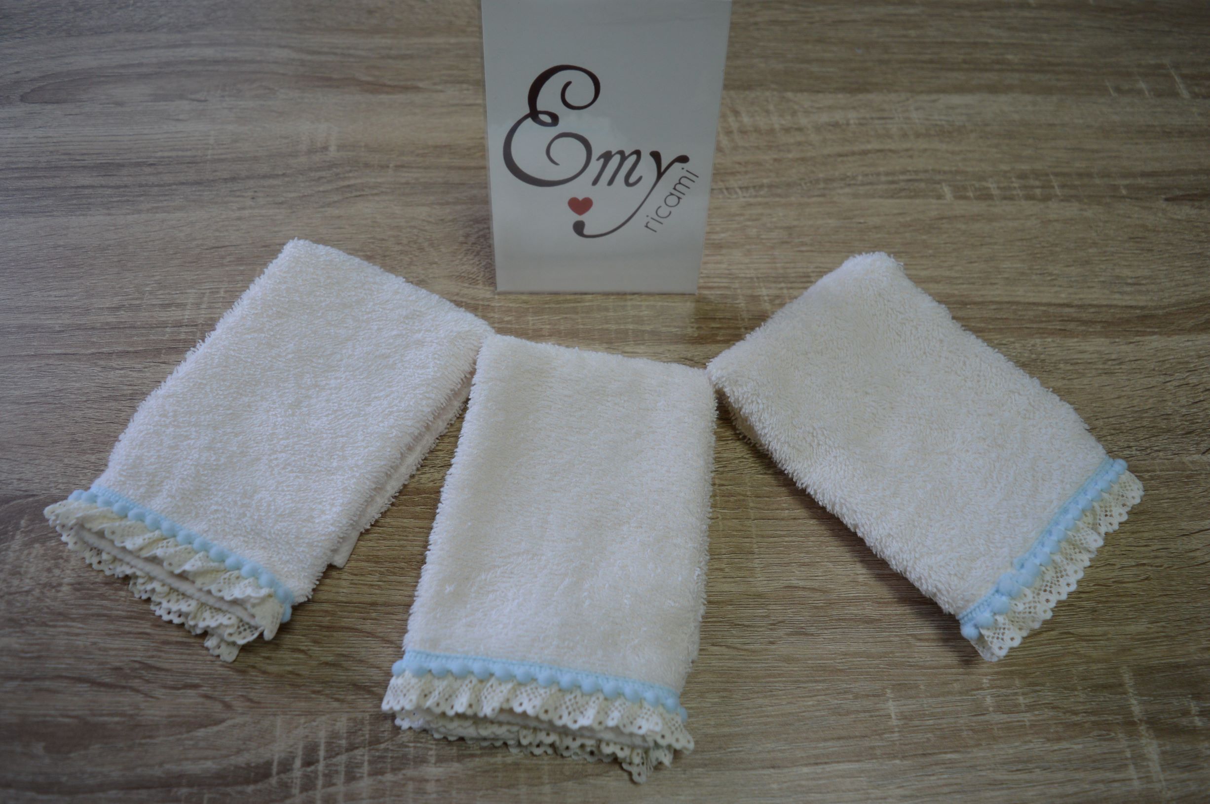 SET 3 PZ LAVETTE MIS 30X30 IN SPUGNA DI PURO COTONE 100% 500 GR AL MQ RIFINITO CON PIZZO AVORIO E CELESTE LAVETTA COLORE AVORIO POSSIBILE SU RICHIESTA FORNITURE X BOMBONIERE ECC..