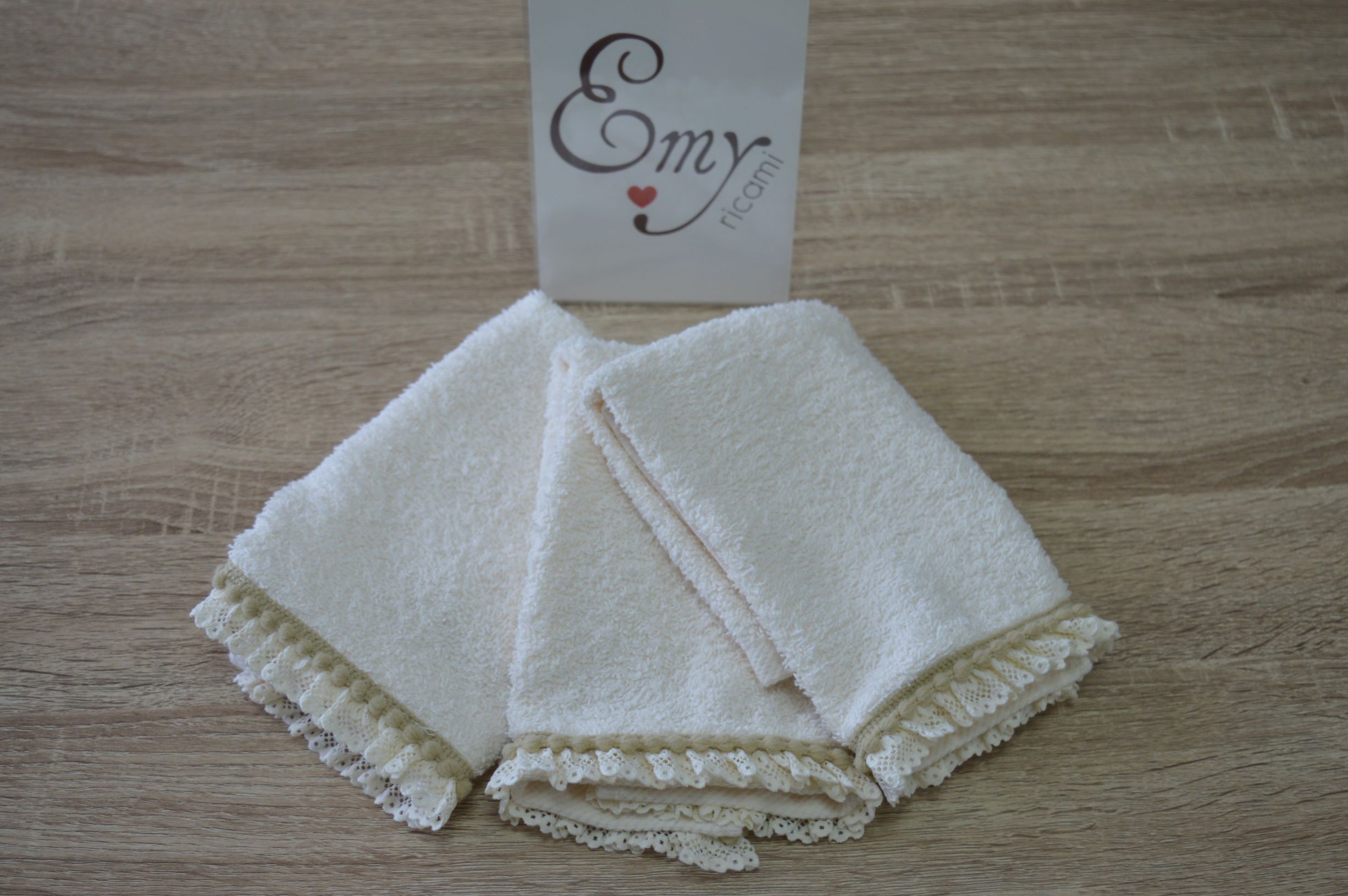 SET 3 PZ LAVETTE MIS 30X30 IN SPUGNA DI PURO COTONE 100% 500 GR AL MQ RIFINITO CON PIZZO AVORIO E TORTORA LAVETTA COLORE AVORIO POSSIBILE SU RICHIESTA FORNITURE X BOMBONIERE ECC...