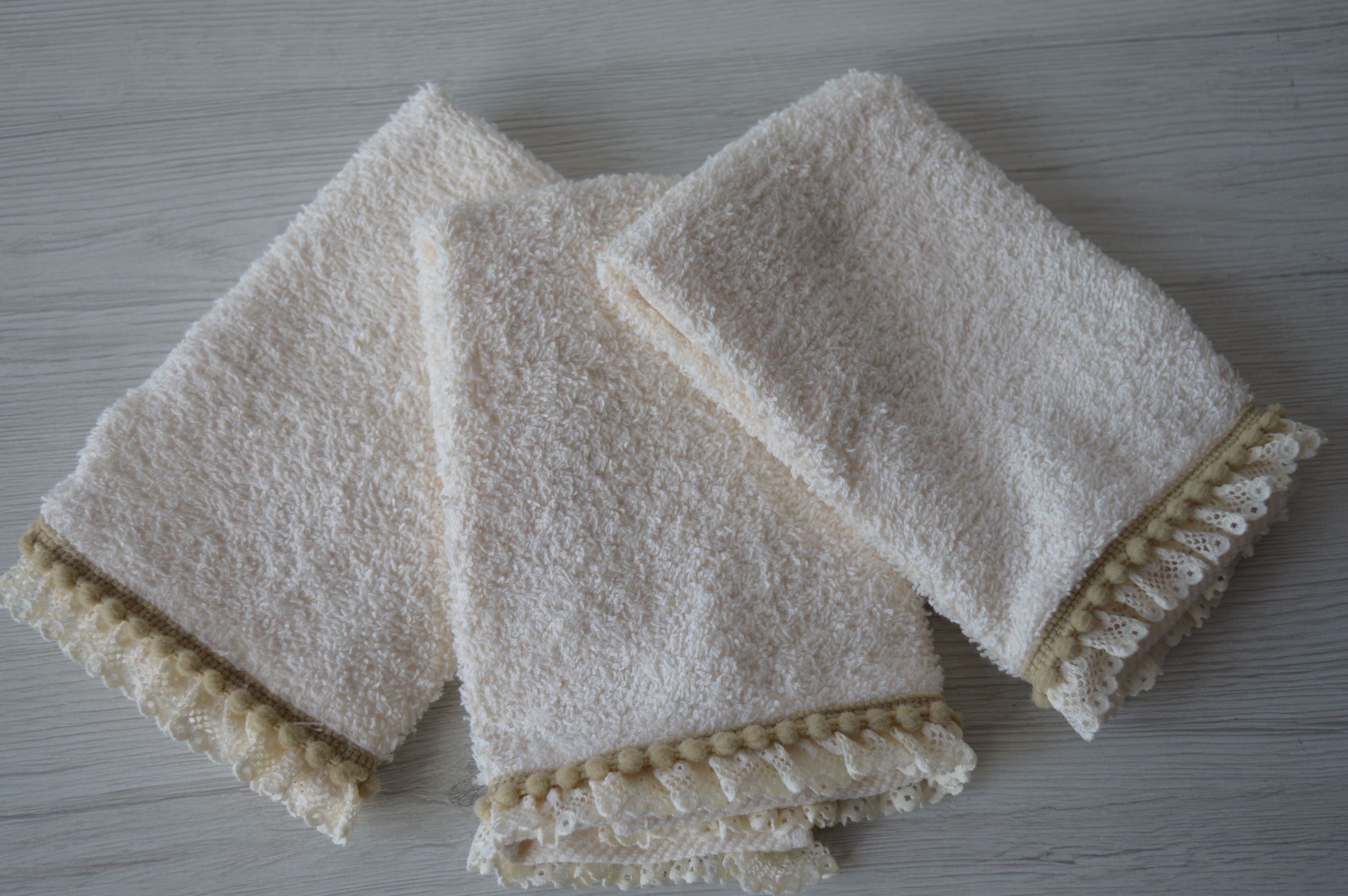 SET 3 PZ LAVETTE MIS 30X30 IN SPUGNA DI PURO COTONE 100% 500 GR AL MQ RIFINITO CON PIZZO AVORIO E TORTORA LAVETTA COLORE AVORIO POSSIBILE SU RICHIESTA FORNITURE X BOMBONIERE ECC...