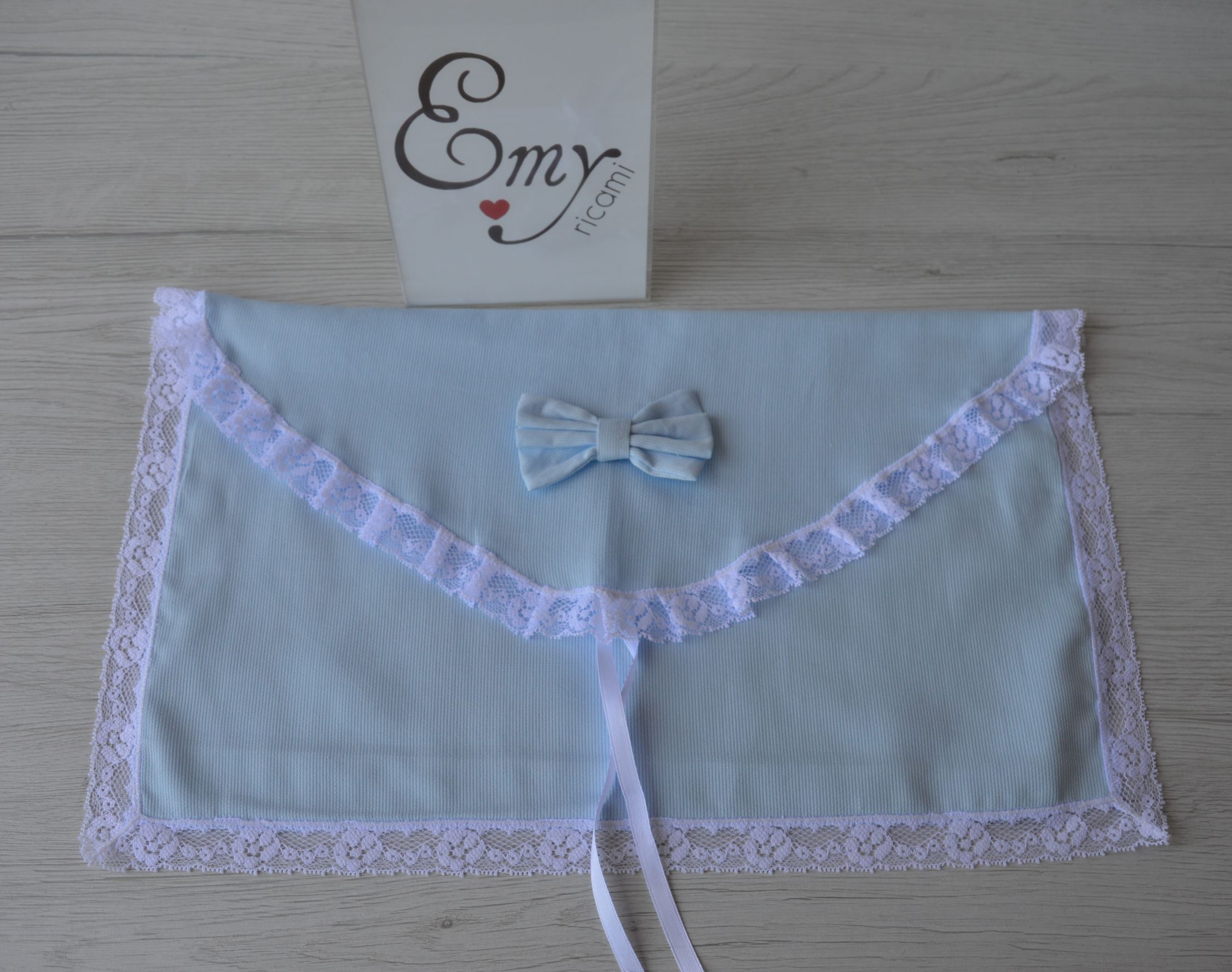 busta primo cambio neonato composizione 100% cotone piquet rifinito con un pregiatissimo pizzo valenciennes colore celeste mis cm 38x22 lavorazione artigianale su richiesta si puo anche personalizzare contattando i nostri info