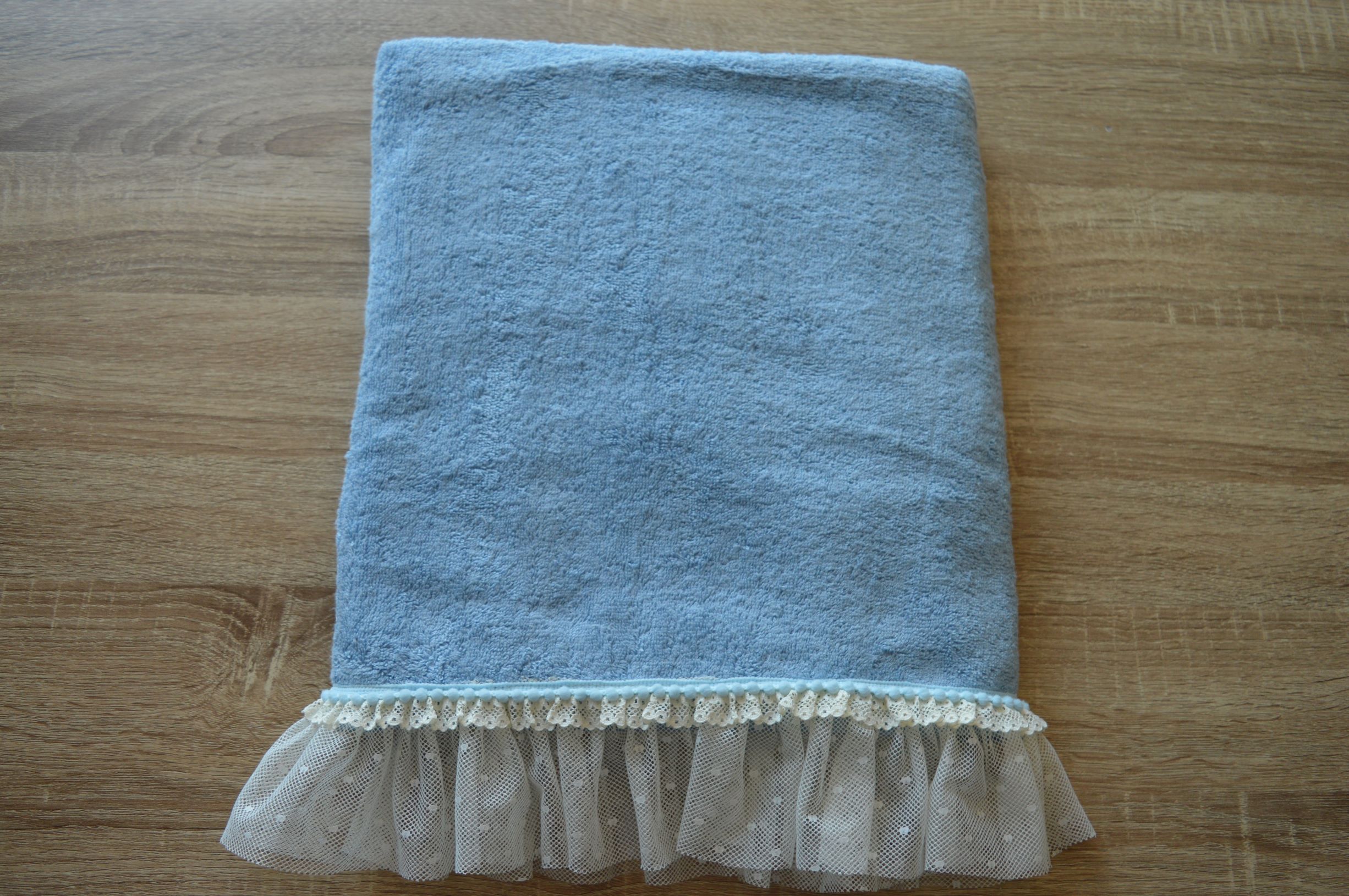 telo spugna artigianale art marta colore cielo composizione 100% cotone mis cm 90x150 peso 500gr al mtq rifinita in basso con tulle e pizzetto col avorio con passamaneria a palline cielo possibilita di personalizzare il prodotto contattare per ulteriori informazioni
