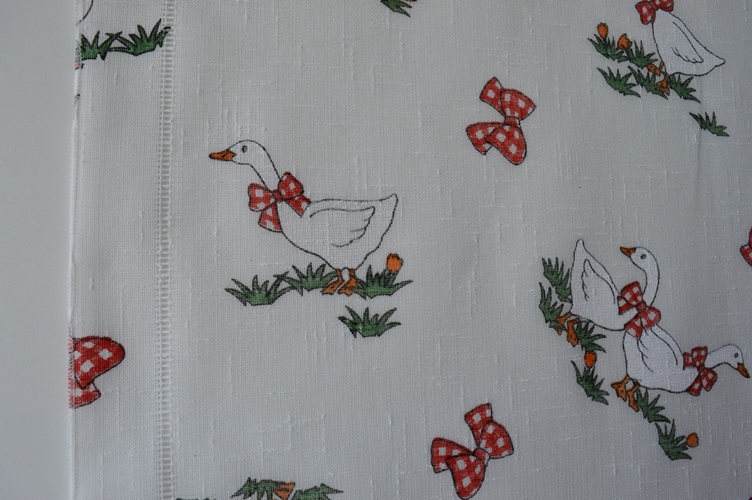 TENDINA A METRAGGIO LARGA CM 60 COLORE BIANCO CON FANTASIA DI PAPERA E FIOCCO ROSSO COMPOSIZIONE 100% POLIESTERE IL PREZZO E LA QUANTITA SI INTENDONO A MT LINEARI
