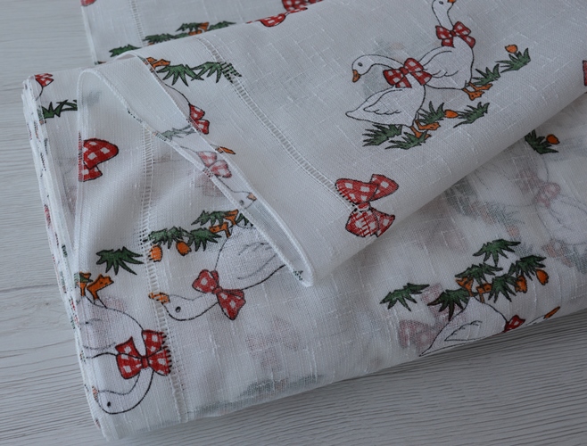 TENDINA A METRAGGIO LARGA CM 60 COLORE BIANCO CON FANTASIA DI PAPERA E FIOCCO ROSSO COMPOSIZIONE 100% POLIESTERE IL PREZZO E LA QUANTITA SI INTENDONO A MT LINEARI