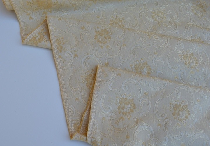 TESSUTO DAMASCATO A METRAGGIO ADATTO PER CUSCINI SEDIE,DIVANI, COPRILETTI,TRAPUNTE TENDAGGI, ECC ALTEZZA 280 CM COLORE BEIGE E ORO COMPOSIZIONE 58% POLIESTERE 42% COTONE IL PREZZO SI INTENDE A MT LINEARI OTTIMA QUALITA OTTIMO IL PREZZO MADE IN ITALY