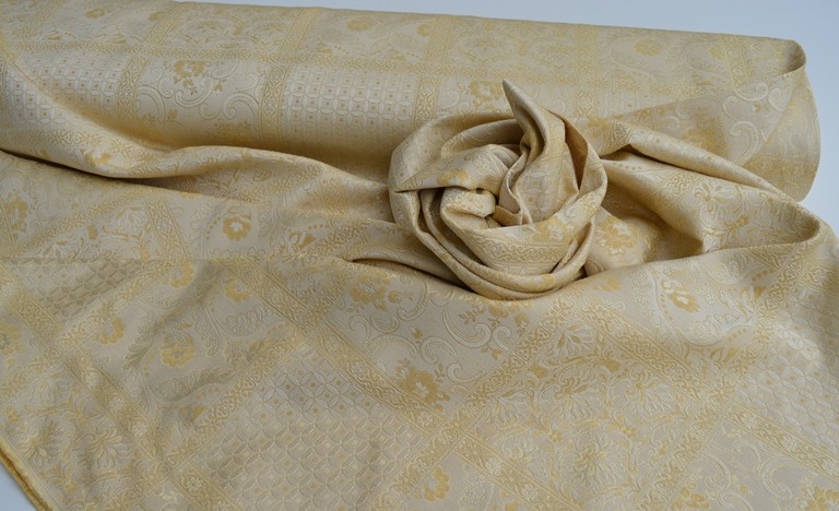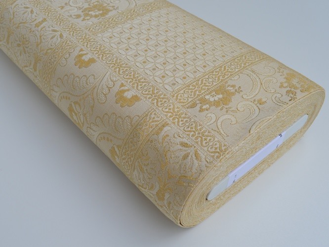 TESSUTO DAMASCATO A METRAGGIO ADATTO PER CUSCINI SEDIE,DIVANI, COPRILETTI,TRAPUNTE TENDAGGI, ECC ALTEZZA 280 CM COLORE BEIGE E ORO COMPOSIZIONE 58% POLIESTERE 42% COTONE IL PREZZO SI INTENDE A MT LINEARI OTTIMA QUALITA OTTIMO IL PREZZO MADE IN ITALY