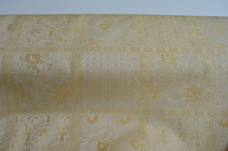TESSUTO DAMASCATO A METRAGGIO ADATTO PER CUSCINI SEDIE,DIVANI, COPRILETTI,TRAPUNTE TENDAGGI, ECC ALTEZZA 280 CM COLORE BEIGE E ORO COMPOSIZIONE 58% POLIESTERE 42% COTONE IL PREZZO SI INTENDE A MT LINEARI OTTIMA QUALITA OTTIMO IL PREZZO MADE IN ITALY
