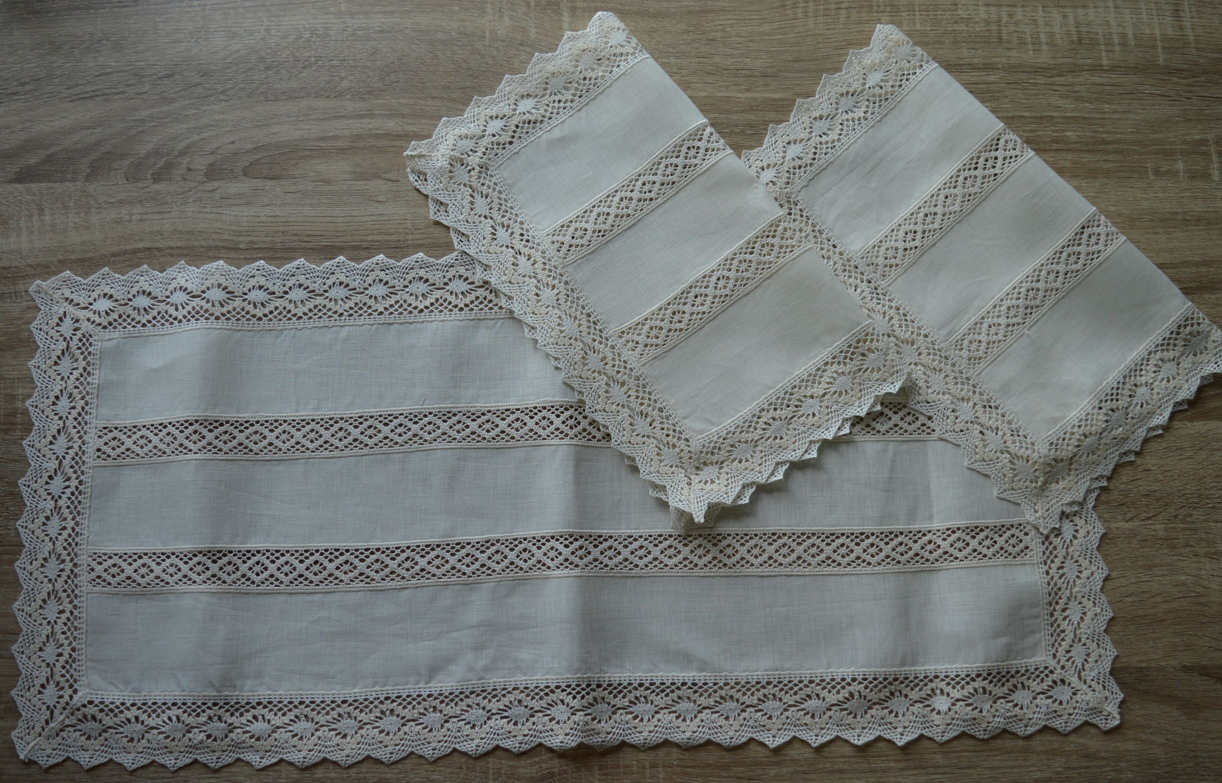 TRIS CENTRI ARIGIANALI DI EMY RICAMY IN LINO E PIZZO TOMBOLO COL AVORIO ART NEREIDE