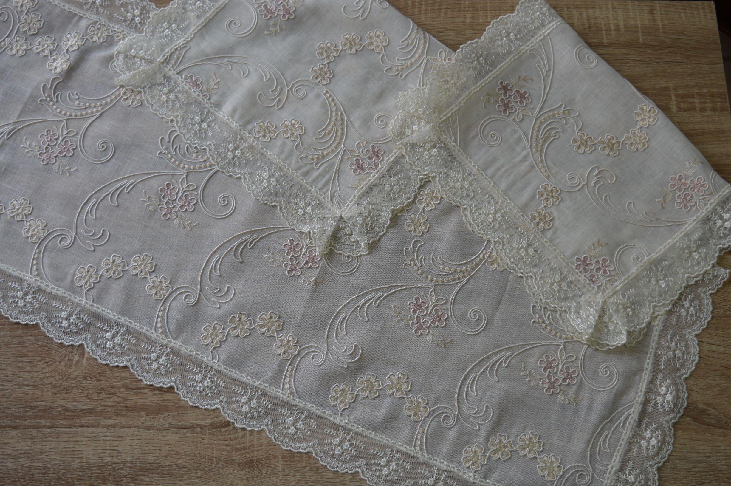 TRIS CENTRI ARTIGIANALE N°1 PEZZO GRANDE MIS CM 42X107 N° 2 PEZZI PICCOLI MIS CM 39X55 COMPOSIZIONE 100% LINO GREZZO RICAMATO A MACCHINA RIFINITO CON PREGIATISSIMO PIZZO IN TULLE RICAMATO COLORE AVORIO CON RICAMI IN ROSA ANTICO IL TUTTO ESEGUITO ARTIGIANALMENTE CONFEZIONATO IN UNA ELEGANTISSIMA SCATOLA PERSONALIZZATA EMY RICAMI