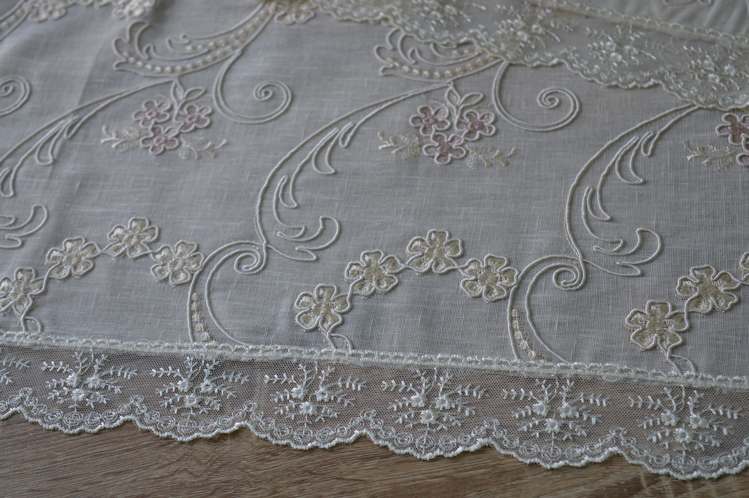 TRIS CENTRI ARTIGIANALE N°1 PEZZO GRANDE MIS CM 42X107 N° 2 PEZZI PICCOLI MIS CM 39X55 COMPOSIZIONE 100% LINO GREZZO RICAMATO A MACCHINA RIFINITO CON PREGIATISSIMO PIZZO IN TULLE RICAMATO COLORE AVORIO CON RICAMI IN ROSA ANTICO IL TUTTO ESEGUITO ARTIGIANALMENTE CONFEZIONATO IN UNA ELEGANTISSIMA SCATOLA PERSONALIZZATA EMY RICAMI