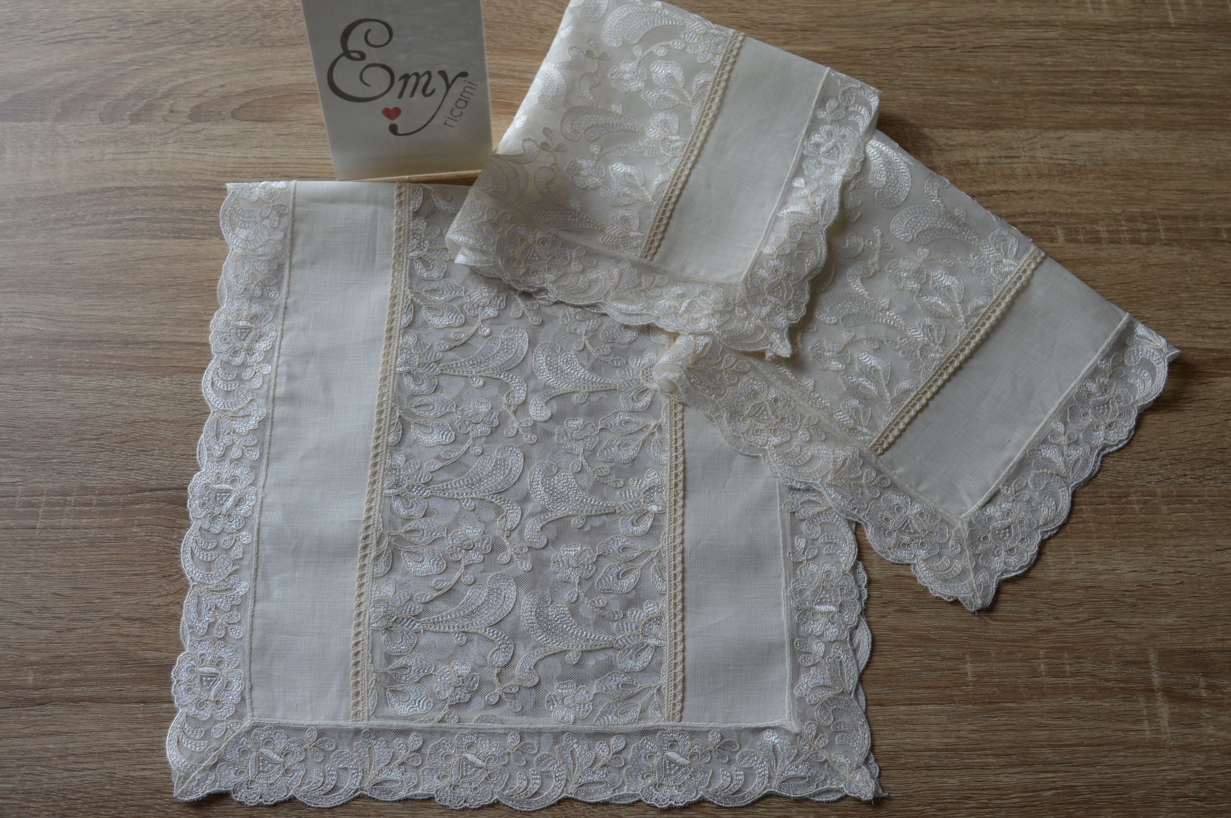 TRIS CENTRI ARTIGIANALE N°1 PEZZO GRANDE MIS CM 38X76 N° 2 PEZZI PICCOLI MIS CM 37X45 COMPOSIZIONE 100% PURO LINO ITALIANO RIFINITO CON PREGIATISSIMO PIZZO IN TULLE RICAMATO COLORE AVORIO IL TUTTO ESEGUITO ARTIGIANALMENTE CONFEZIONATO IN UNA ELEGANTISSIMA SCATOLA PERSONALIZZATA EMY RICAMI PREVIO CONTATTI SI PUO ANCHE PERSONALIZZARE