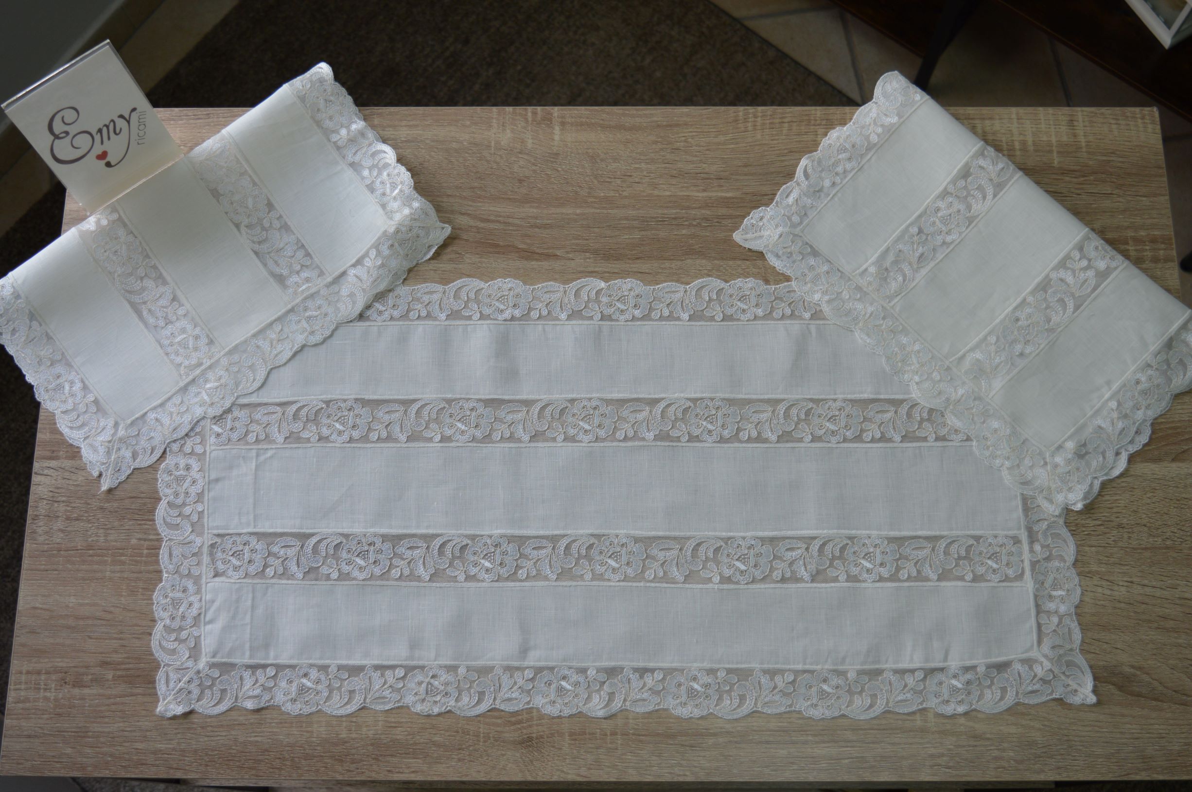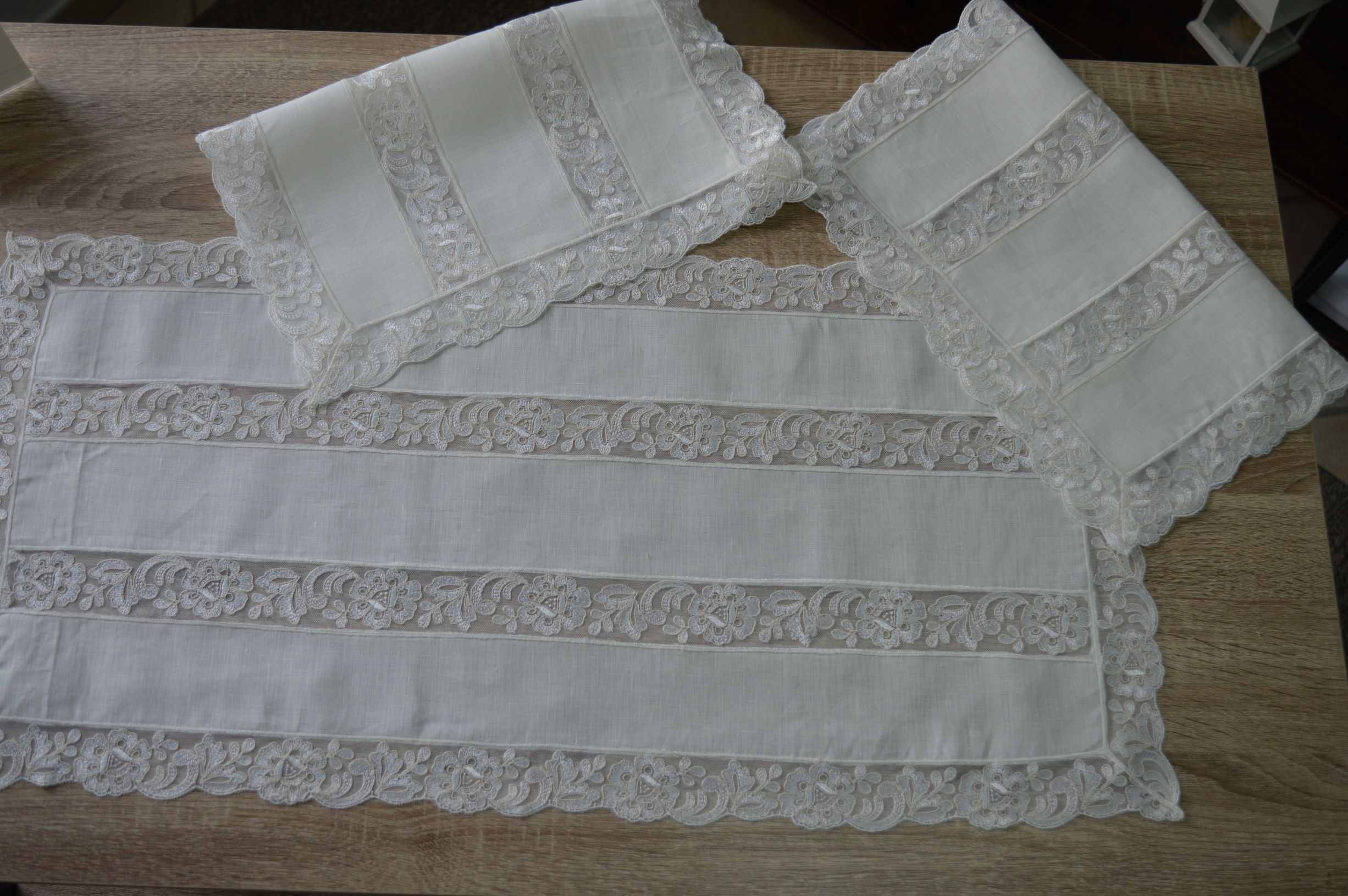 TRIS CENTRI ARTIGIANALE N°1 PEZZO GRANDE MIS CM 37X77 N° 2 PEZZI PICCOLI MIS CM 39X44 COMPOSIZIONE 100% PURO LINO ITALIANO RIFINITO CON PREGIATISSIMO PIZZO IN TULLE RICAMATO COLORE AVORIO E BEIGE IL TUTTO ESEGUITO ARTIGIANALMENTE CONFEZIONATO IN UNA ELEGANTISSIMA SCATOLA PERSONALIZZATA EMY RICAMI PREVIO CONTATTI SI PUO ANCHE PERSONALIZZARE