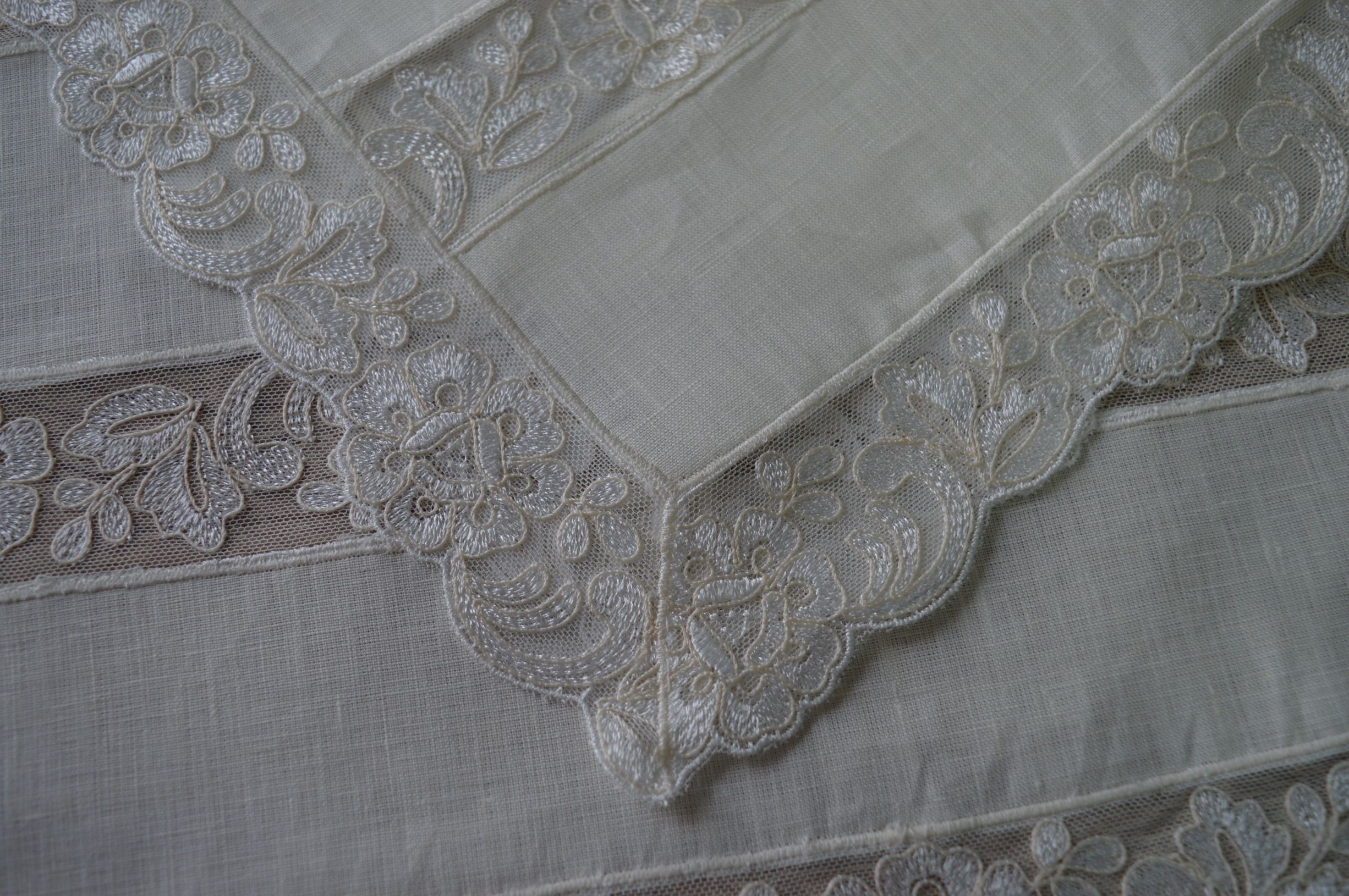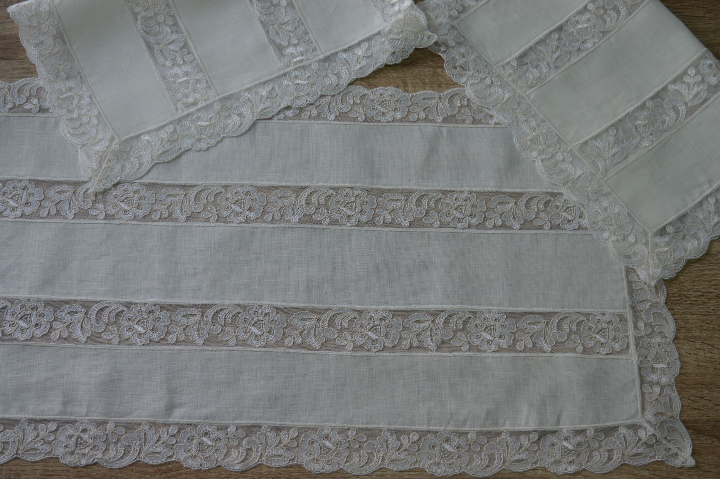 TRIS CENTRI ARTIGIANALE N°1 PEZZO GRANDE MIS CM 37X77 N° 2 PEZZI PICCOLI MIS CM 39X44 COMPOSIZIONE 100% PURO LINO ITALIANO RIFINITO CON PREGIATISSIMO PIZZO IN TULLE RICAMATO COLORE AVORIO E BEIGE IL TUTTO ESEGUITO ARTIGIANALMENTE CONFEZIONATO IN UNA ELEGANTISSIMA SCATOLA PERSONALIZZATA EMY RICAMI PREVIO CONTATTI SI PUO ANCHE PERSONALIZZARE