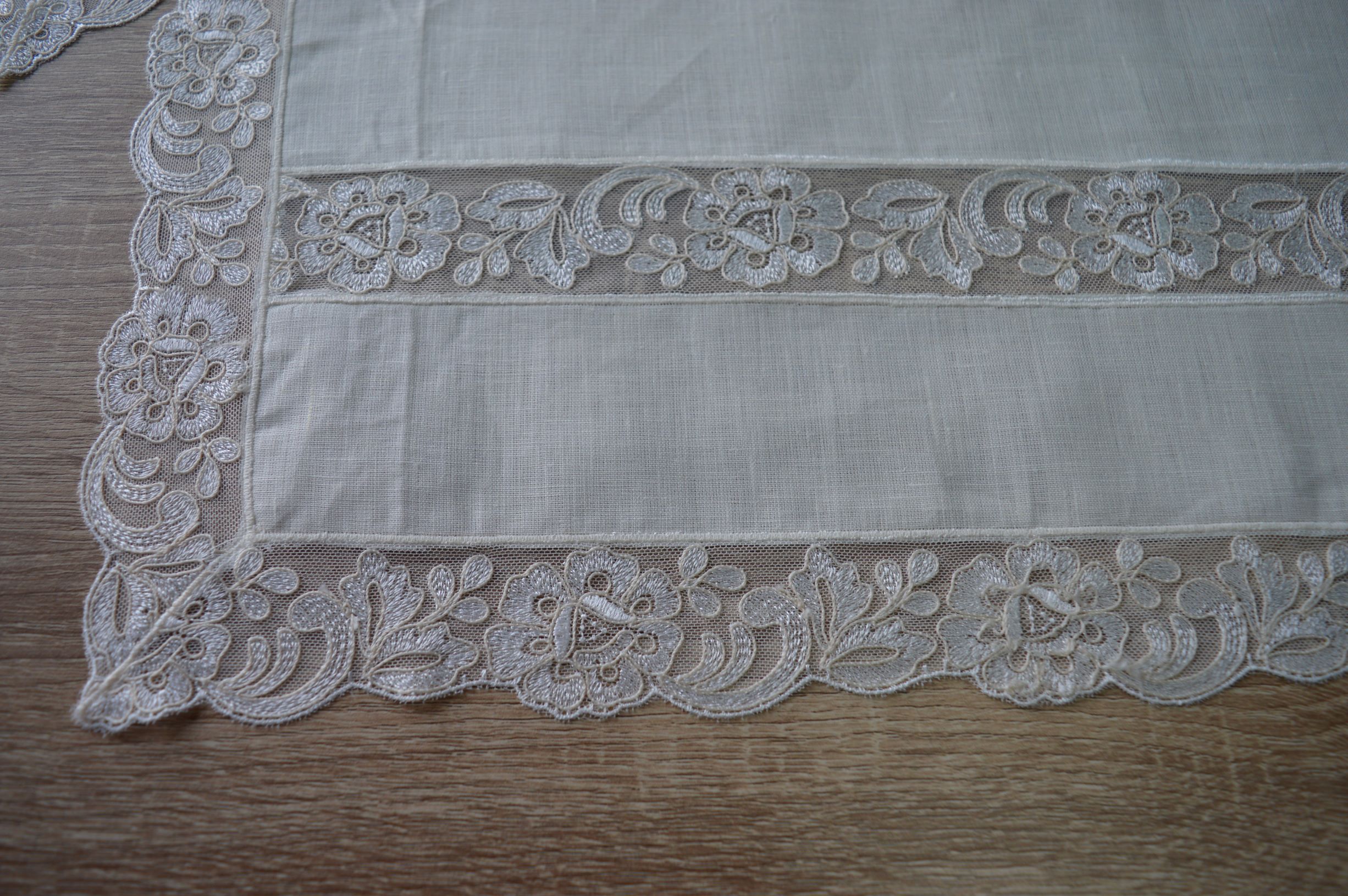 TRIS CENTRI ARTIGIANALE N°1 PEZZO GRANDE MIS CM 37X77 N° 2 PEZZI PICCOLI MIS CM 39X44 COMPOSIZIONE 100% PURO LINO ITALIANO RIFINITO CON PREGIATISSIMO PIZZO IN TULLE RICAMATO COLORE AVORIO E BEIGE IL TUTTO ESEGUITO ARTIGIANALMENTE CONFEZIONATO IN UNA ELEGANTISSIMA SCATOLA PERSONALIZZATA EMY RICAMI PREVIO CONTATTI SI PUO ANCHE PERSONALIZZARE