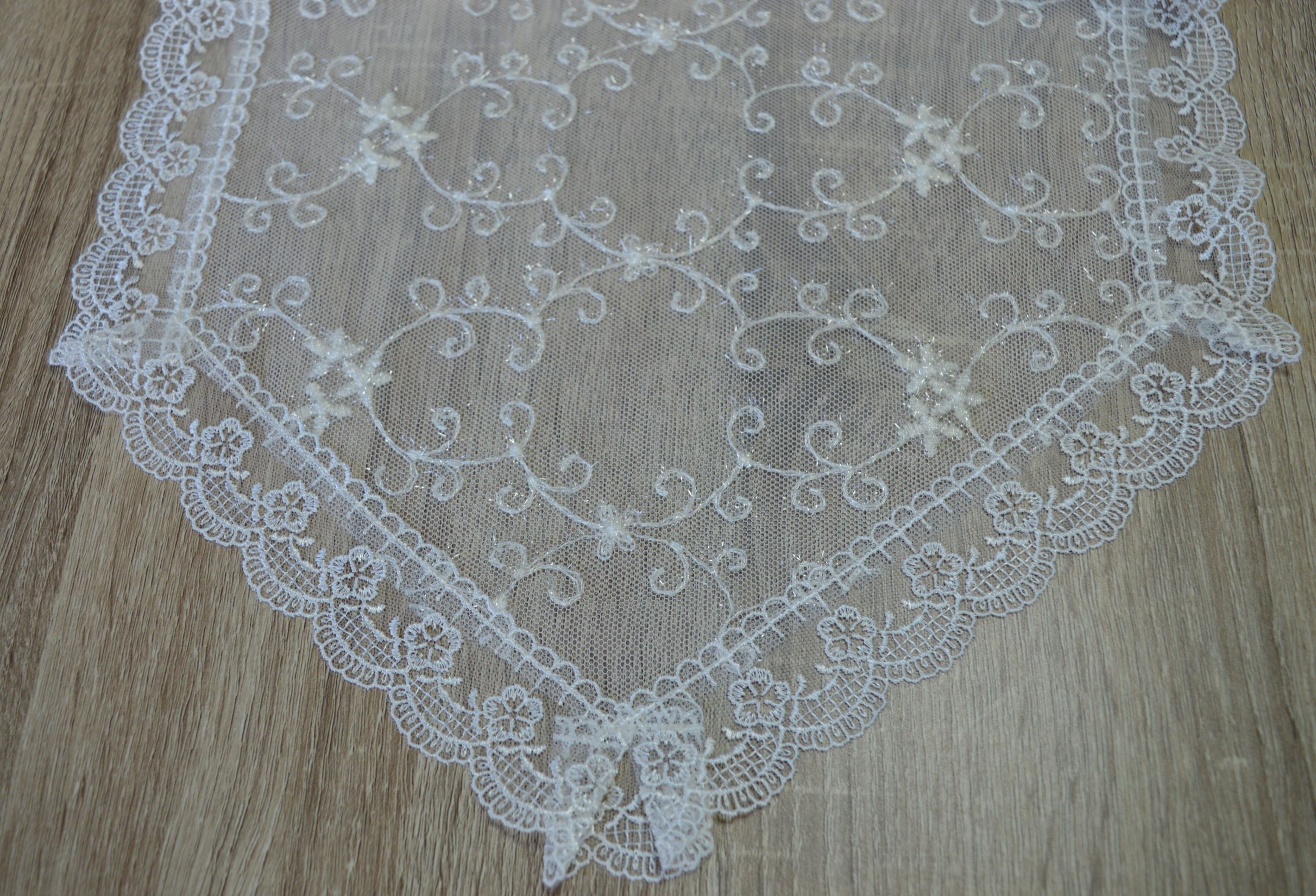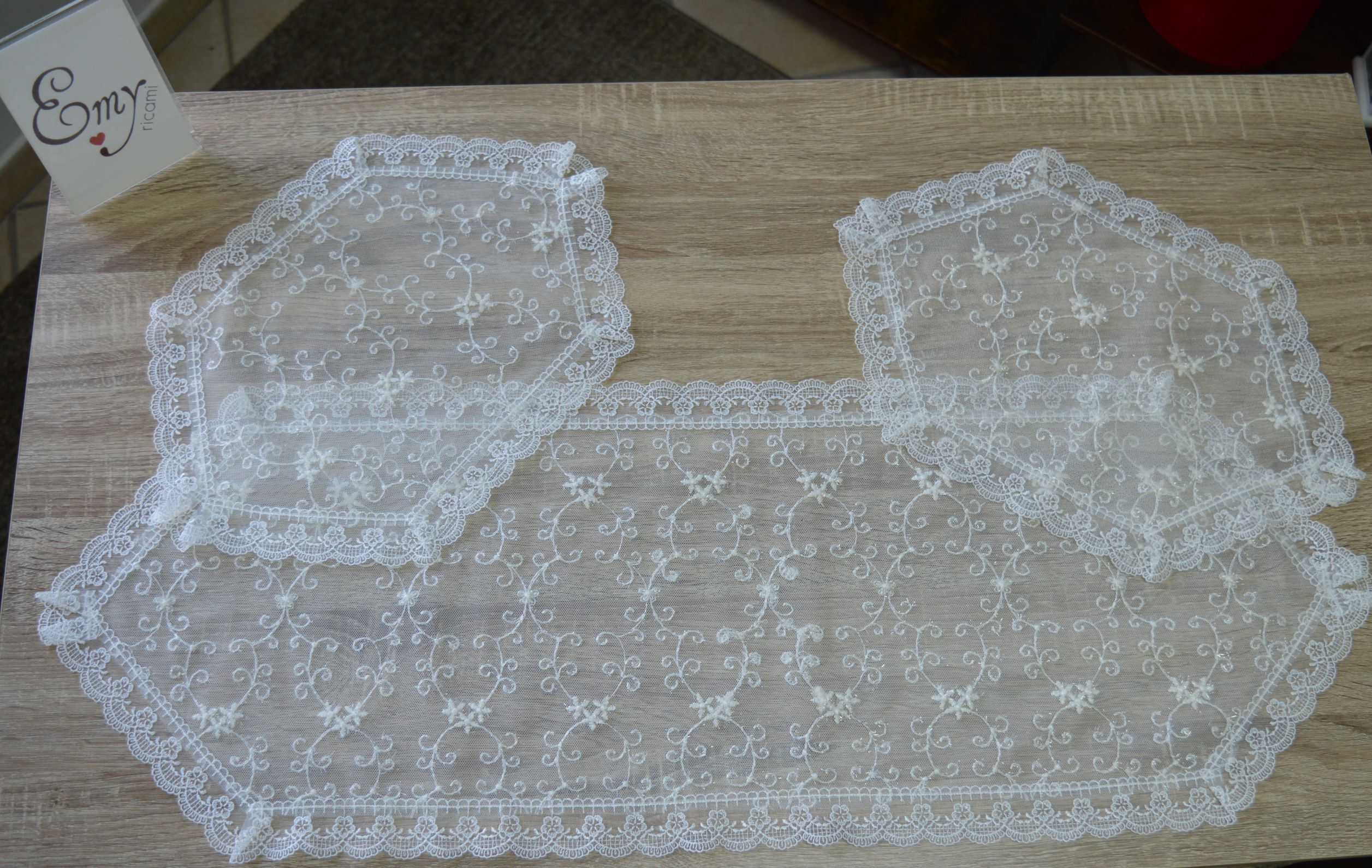 tris centri artigianali di Emy ricami in tulle ricamato pz 1 grande mis cm 90x33 pz 2 piccoli mis cm 40x28 colore avorio comp. 100% poliestere confezionato in una elegante scatola personalizzata emy ricami