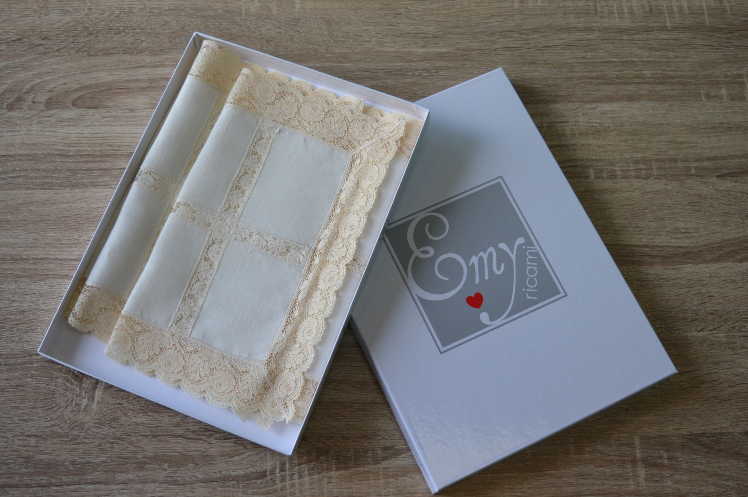 il tris viene consegnato in una elegantissima scatola regalo personalizzate Emy ricami