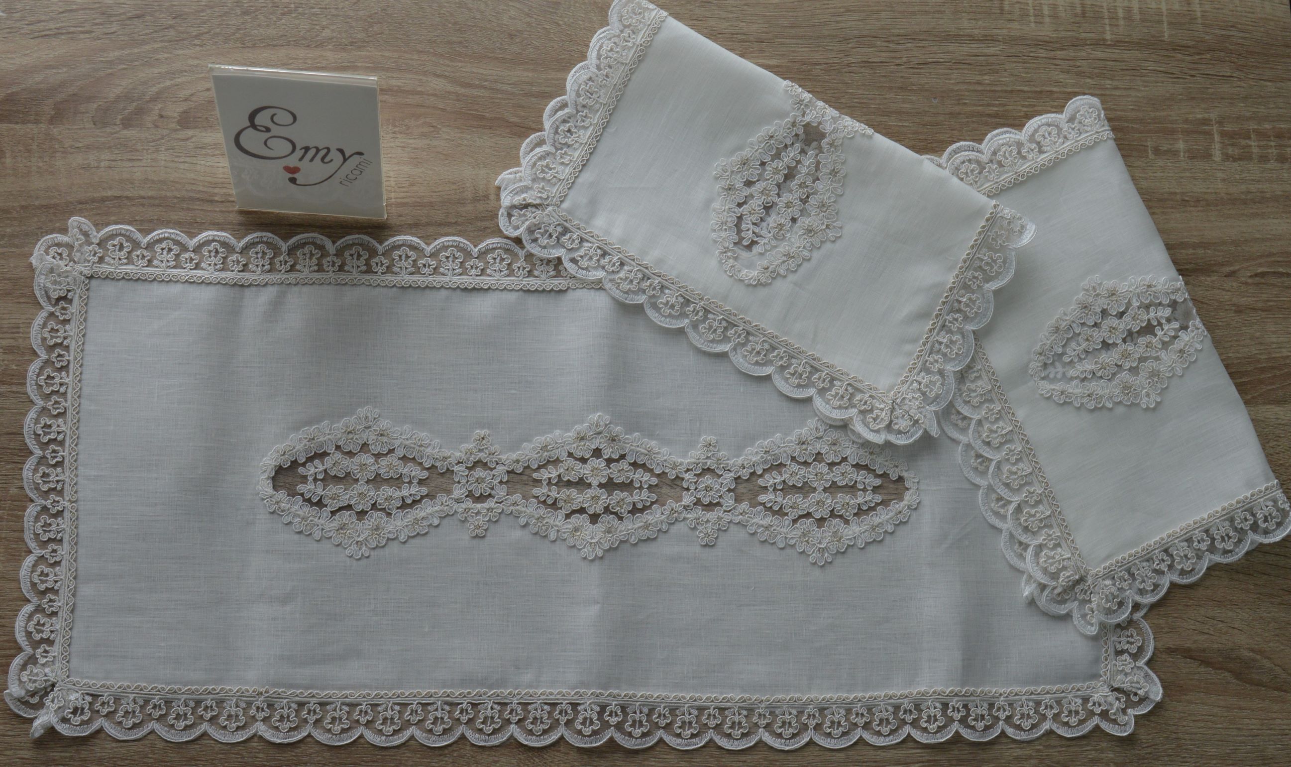 TRIS CENTRI ARTIGIANALI DI EMY RICAMI IN LINO E REBRODÈ PZ 1 MIS GRANDE CM 34X75 PZ 2 MIS PICCOLA CM 34X40 COMPOSIZIONE 100% PURO LINO ITALIANO RIFINITO CON PREGIATISSIMO REBRODÈ IL TUTTO CONFEZIONATO IN UN ELEGANTISSIMA SCATOLA PERSONALIZZATA EMY RICAMI è POSSIBILE SU RICHIESTA PERSONALIZZARE ANCHE LE MISURE